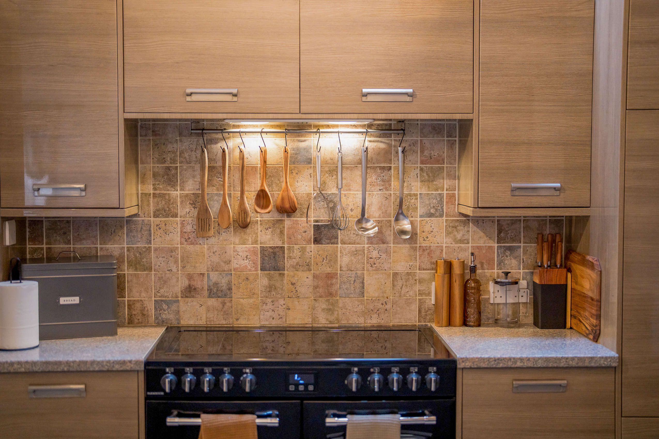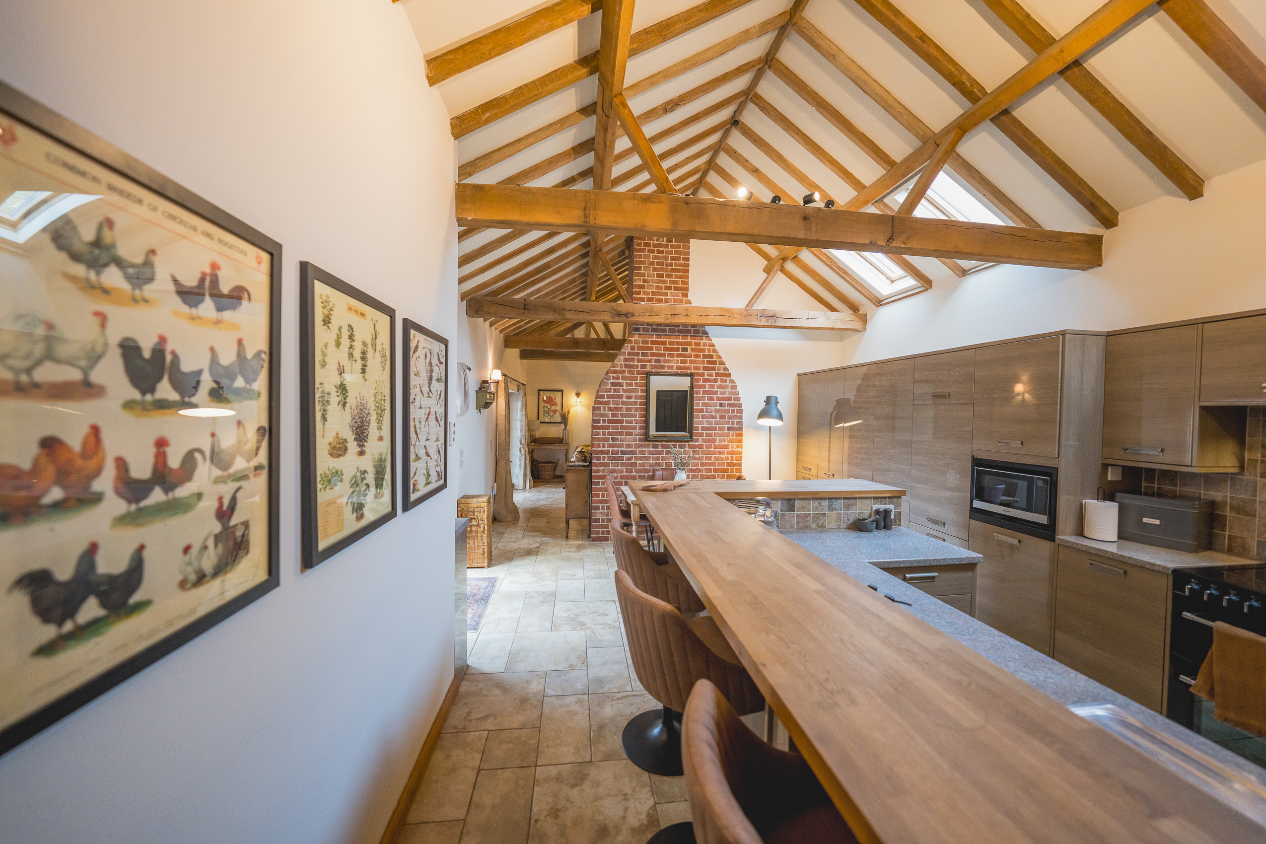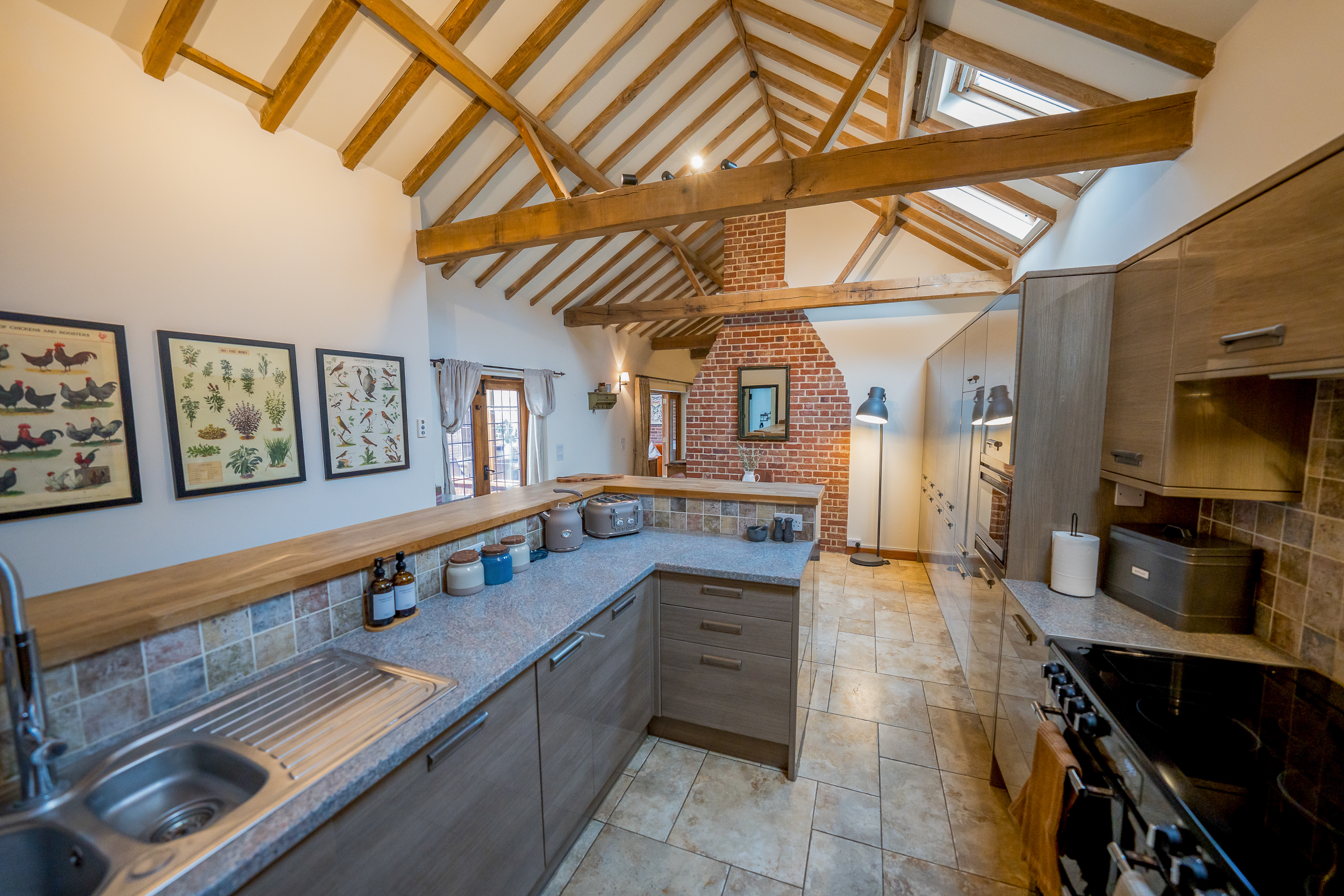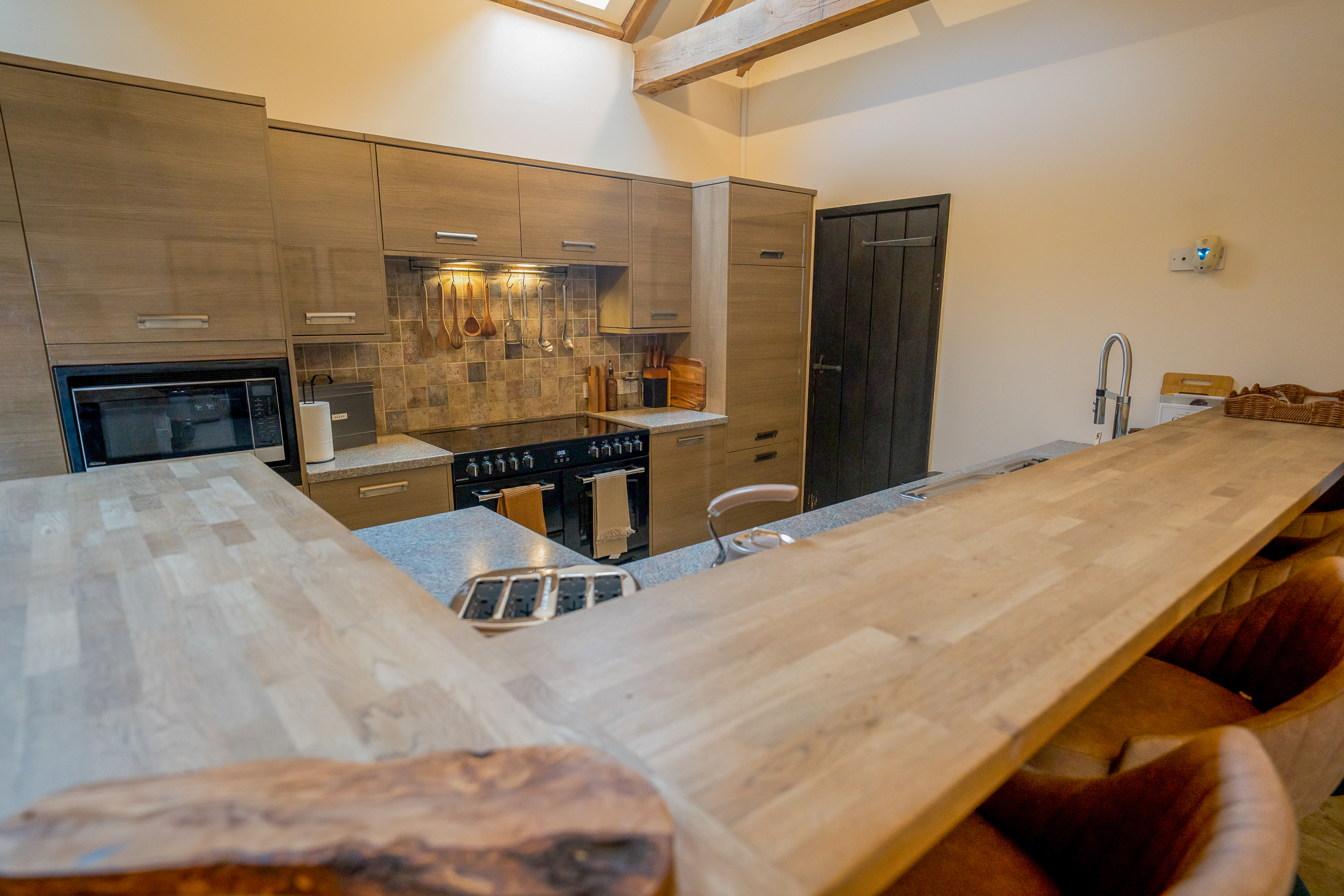 Kitchen: The kitchen is stylish yet practical and equipped with everything you need. Skylights fill the room with light, and the U-shaped layout provides ample prep space. A generous breakfast bar with stools, large range-style cooker and quality cookware create a sociable cooking space designed to make group meals feel effortless. Just off the kitchen is a relaxed dining nook with a rustic wooden table and modern chairs.