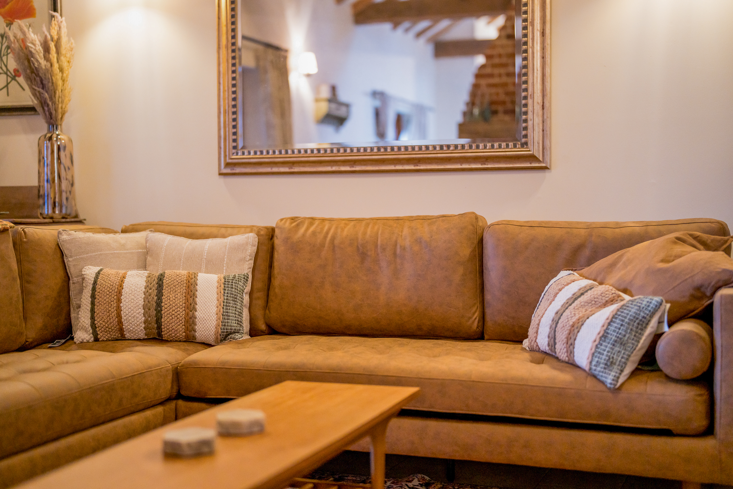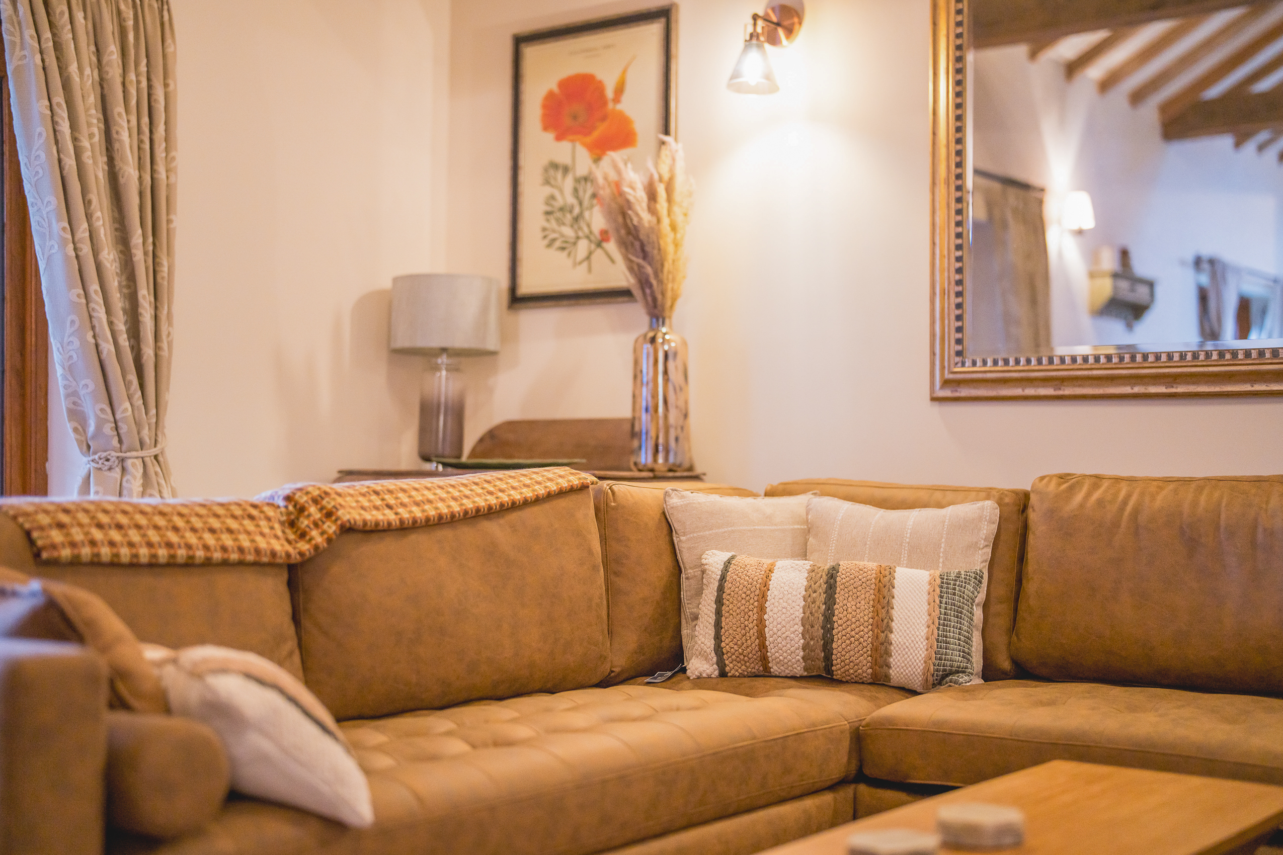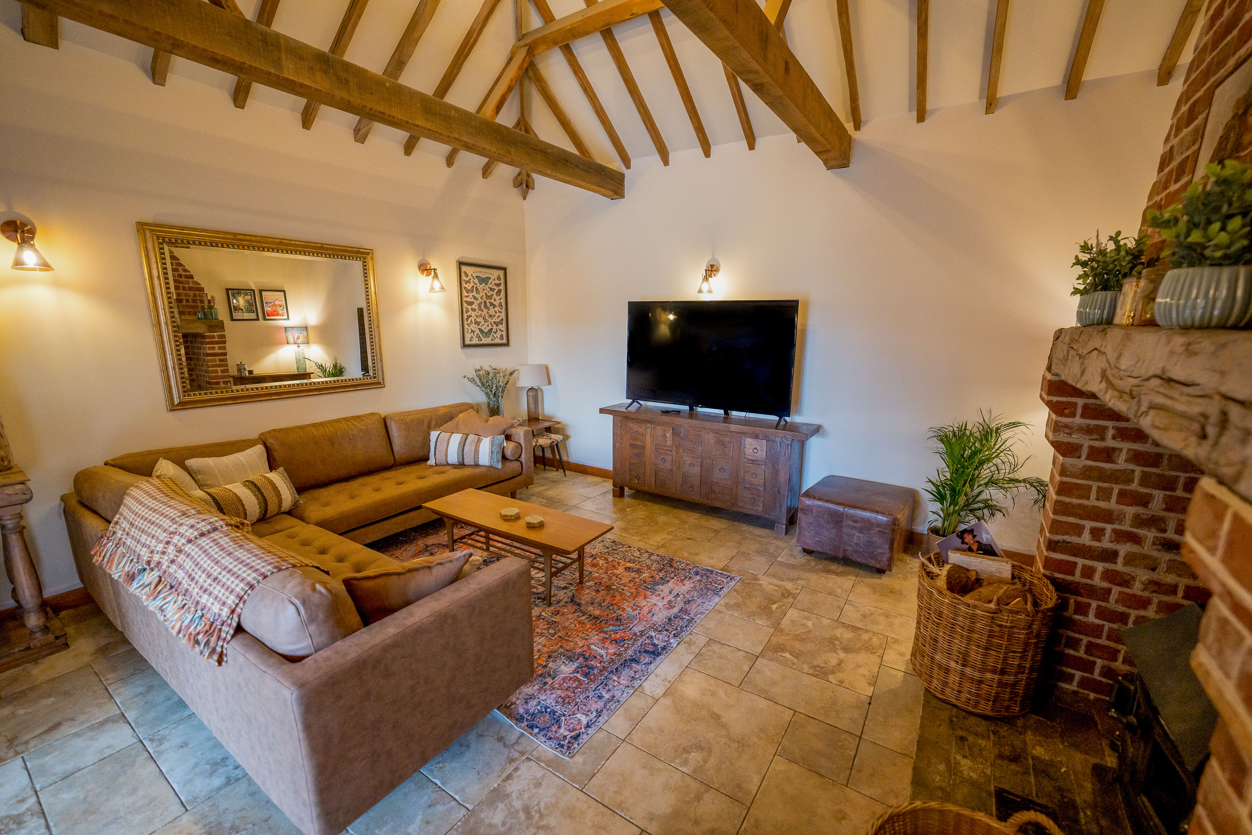 Lounge: A large living space with exposed beams, soft lighting and a huge corner sofa perfect for sinking into. Styled in warm earthy tones with a vintage-style rug and oak furnishings, the lounge is ideal for evenings in, board games, films or for simply putting your feet up.