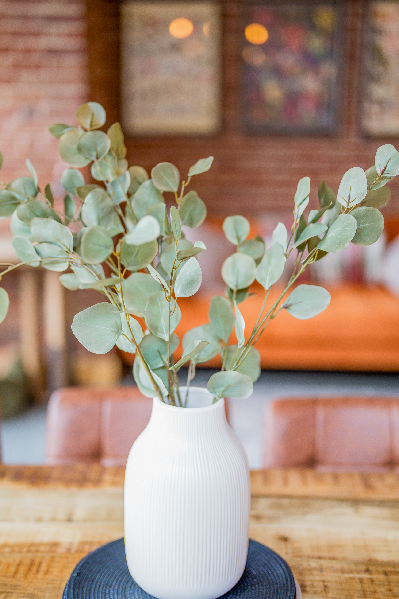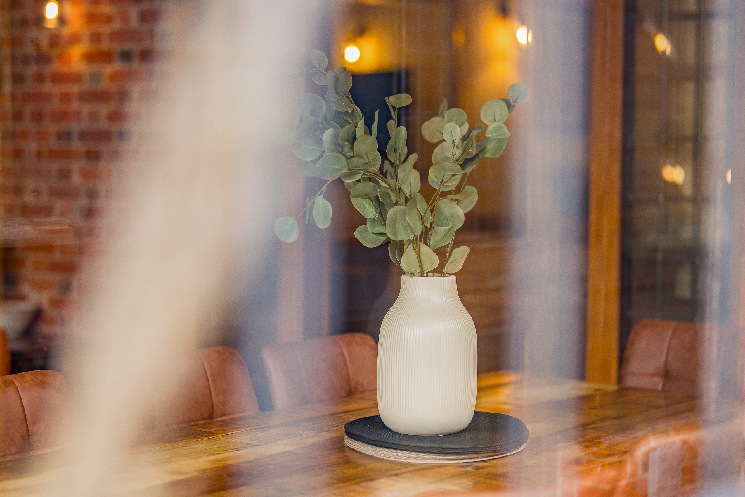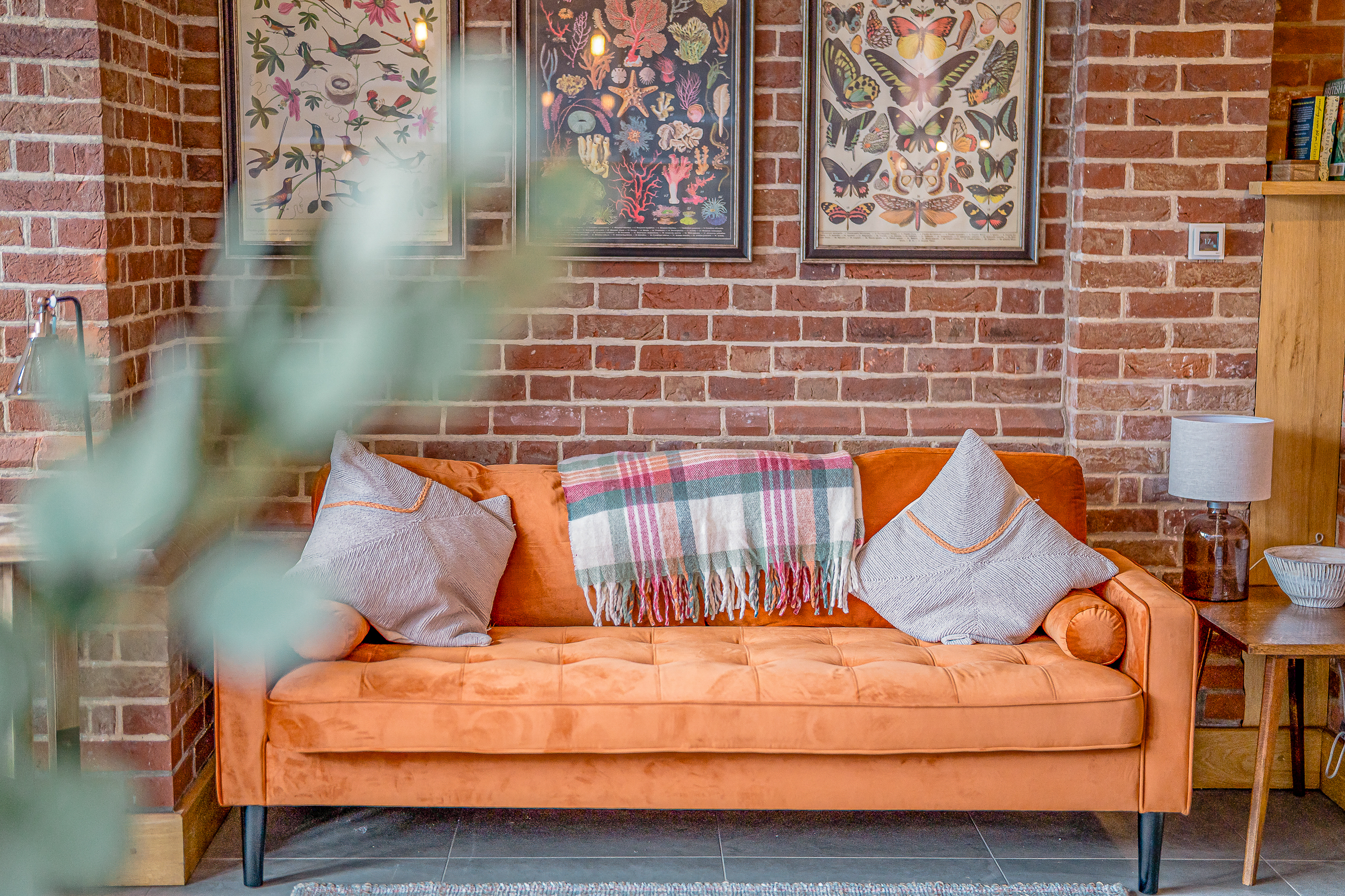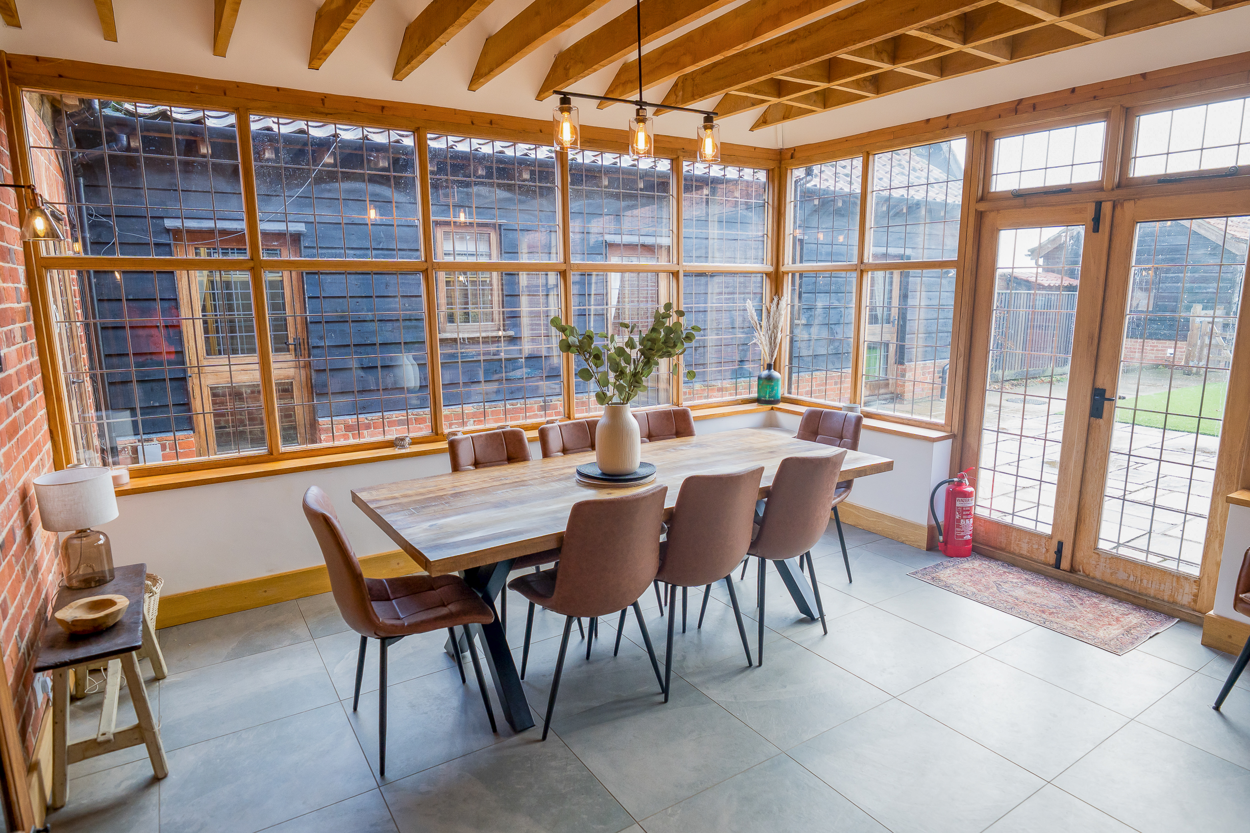 Garden Room: Wrapped in Suffolk brick with floor-to-ceiling windows, the garden room is a bright social space. A large wooden dining table seats everyone comfortably and the velvet sofa offers a cosy reading corner. Wide doors open onto the patio, making this room perfect for every season.