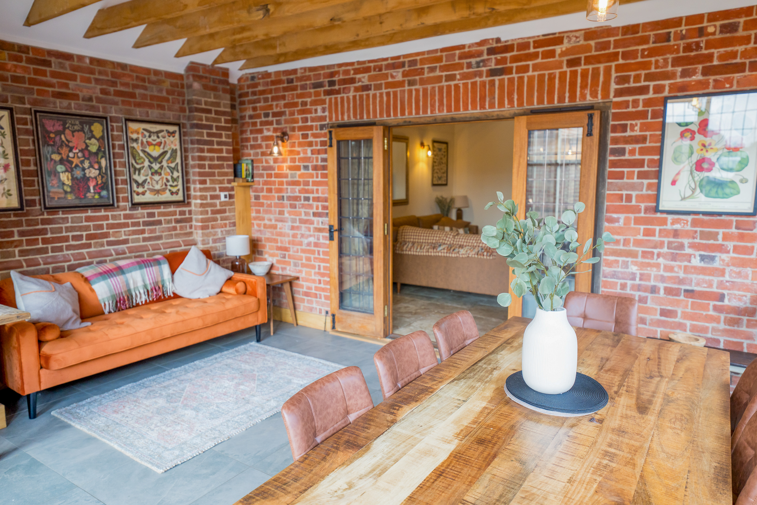 With four beautifully finished ensuite bedrooms, a vast open-plan living space and a private enclosed garden, DeBerri gives groups generous room to gather, relax and recharge. Its original architecture remains proudly on show, with vaulted ceilings, exposed oak beams, Suffolk brickwork and pamment-style flooring, all softened with calm textures and carefully chosen, high-quality furnishings. Light pours in from every direction, creating interiors that feel both expansive and deeply inviting.
