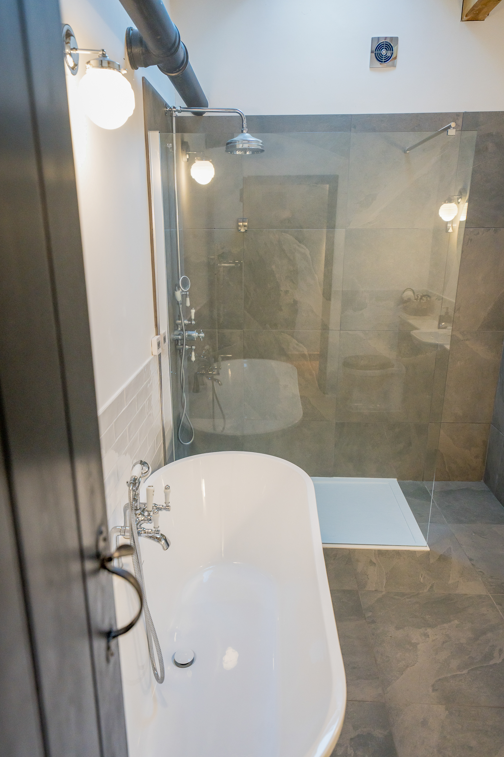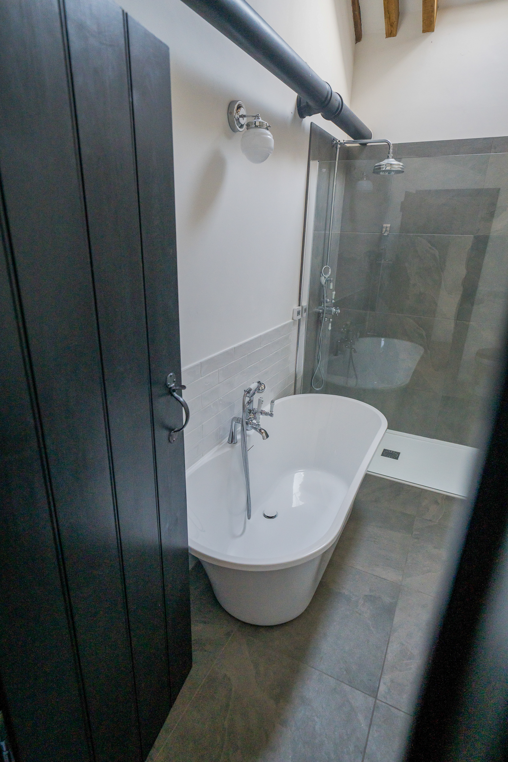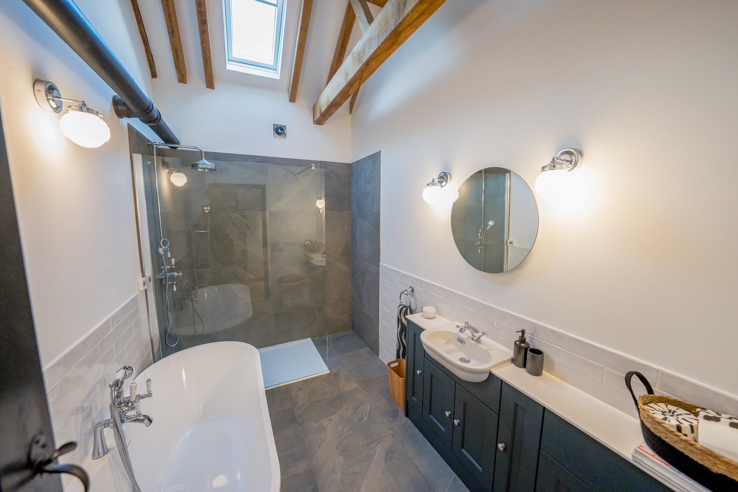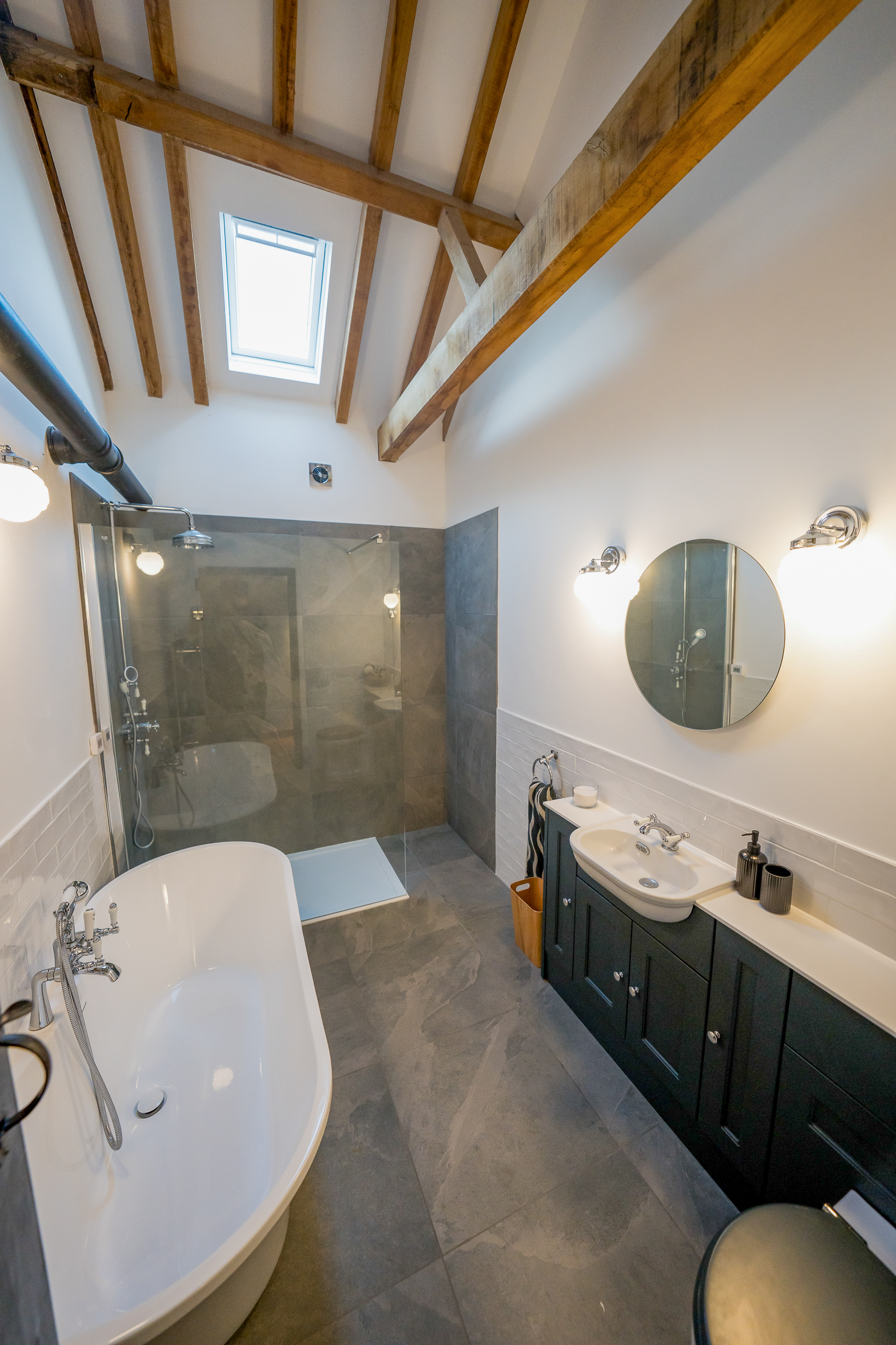Main Bathroom: A luxurious, spa-style bathroom featuring a deep freestanding bath, a large walk-in rainfall shower, modern vanity storage and soft grey stone tiling. Vaulted ceilings and exposed beams add to the barn’s original character and preserved history.