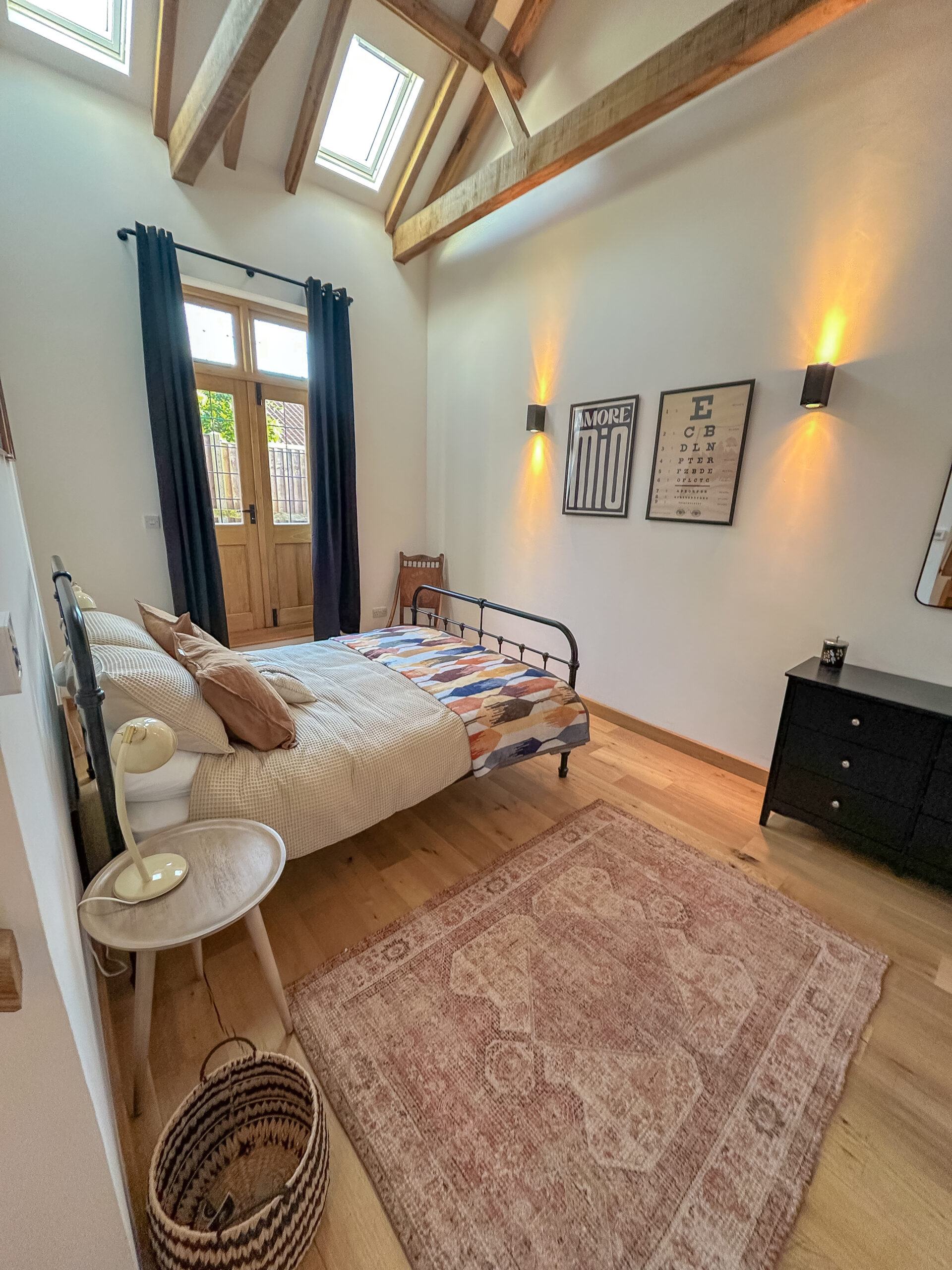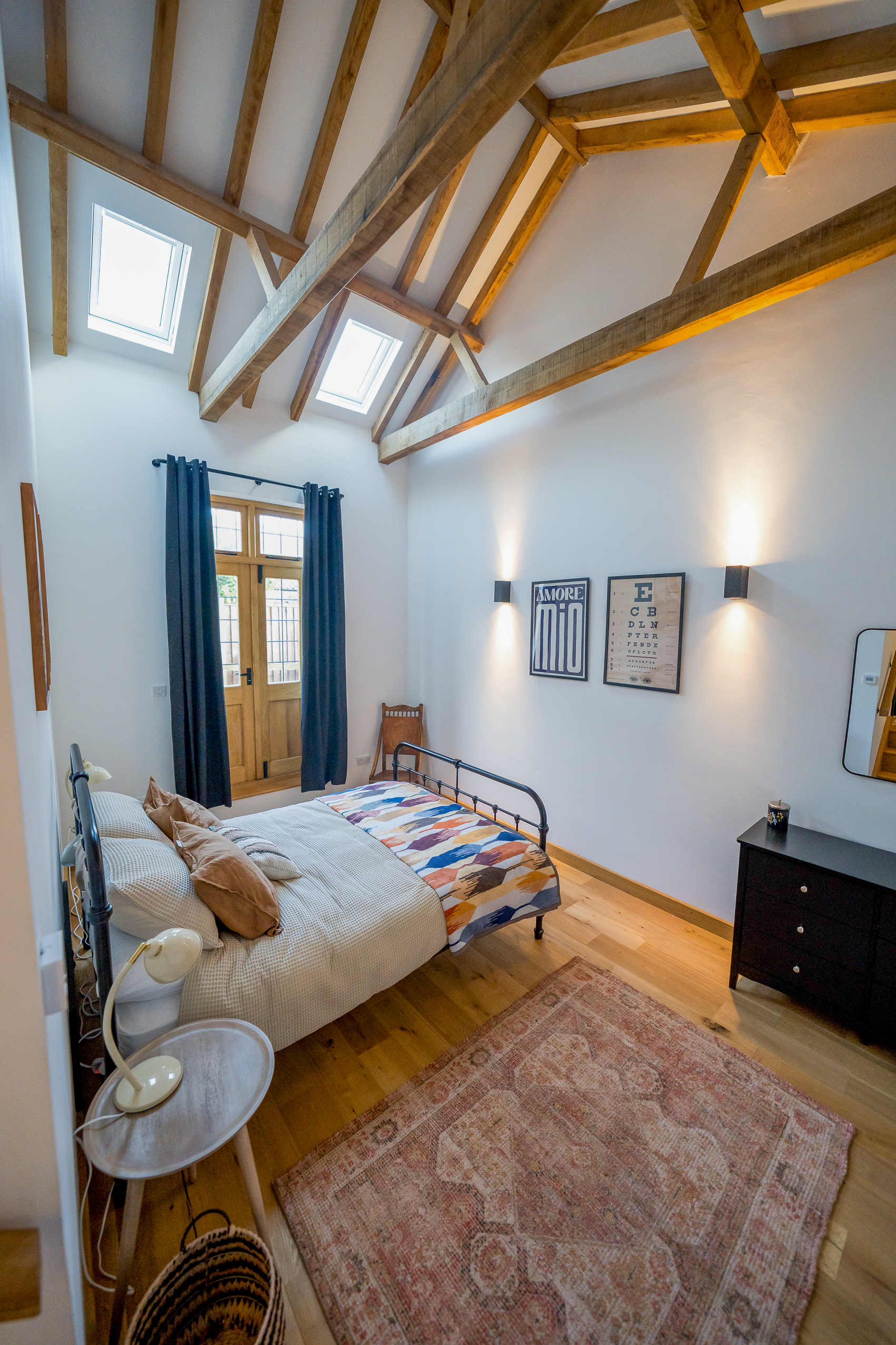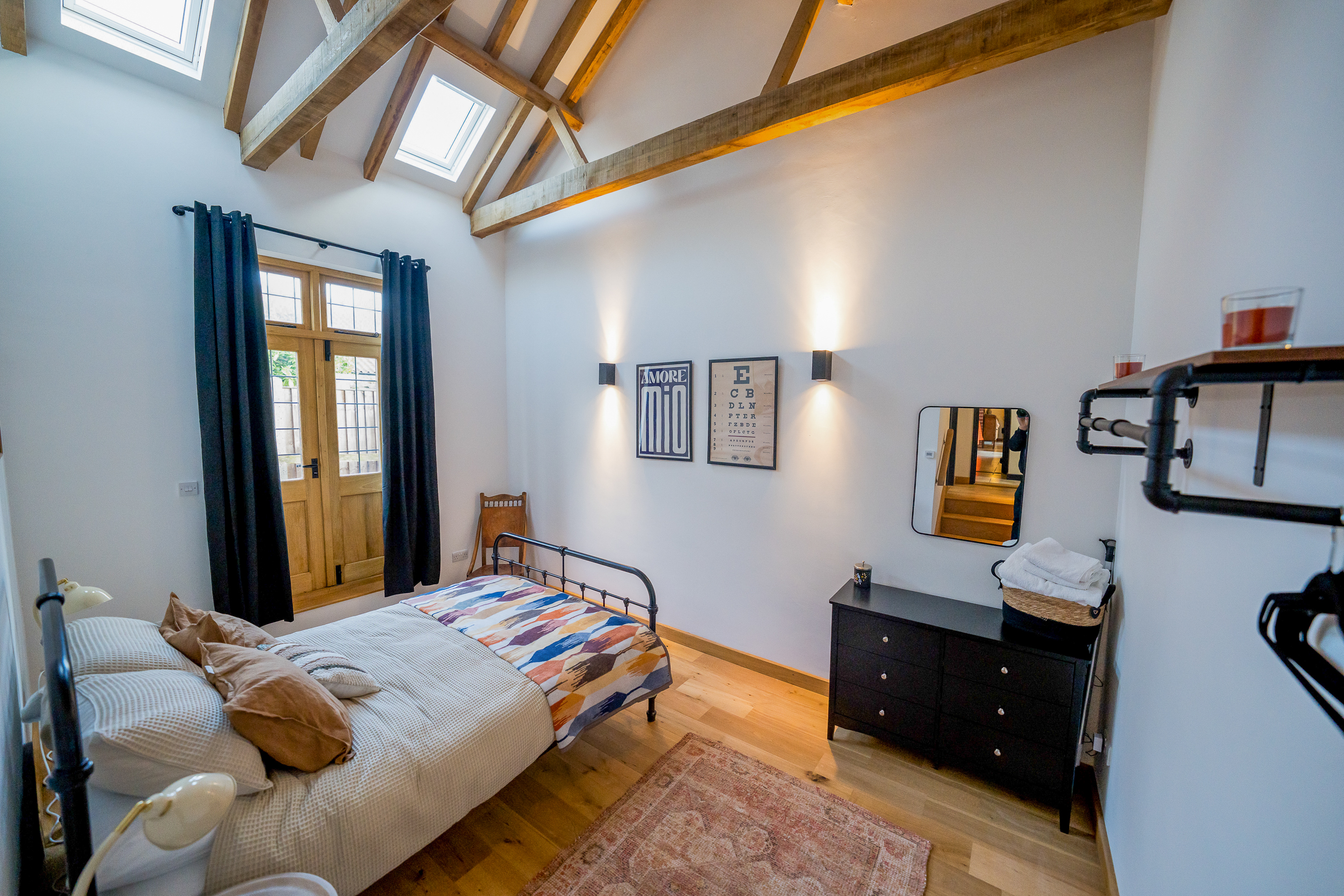 Master Bedroom (Ensuite): A beautiful retreat with exposed beams, high vaulted ceilings and French doors opening out onto the garden. The décor is soft, comforting and boutique-hotel chic. The ensuite features a modern shower, contemporary tiling and a bright, fresh finish.