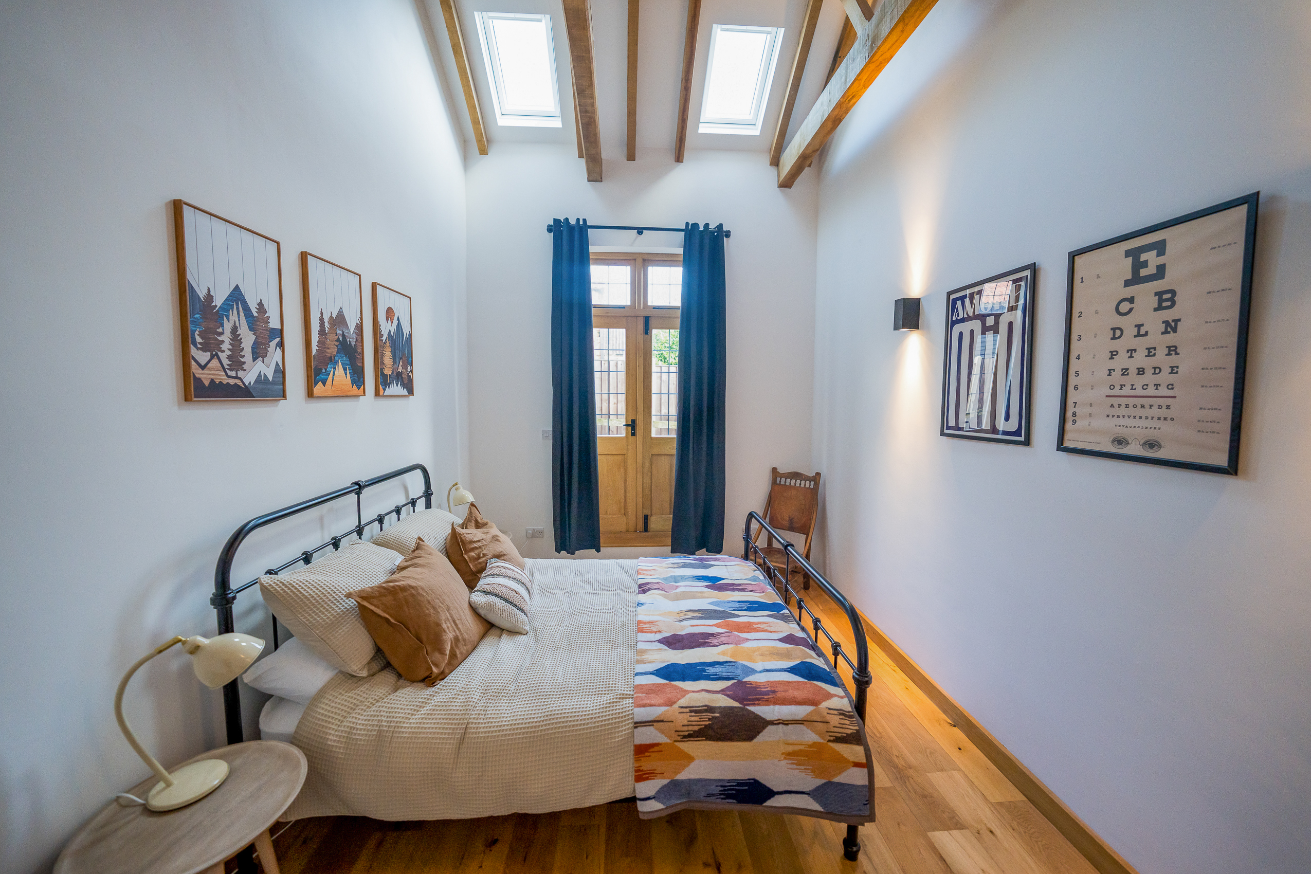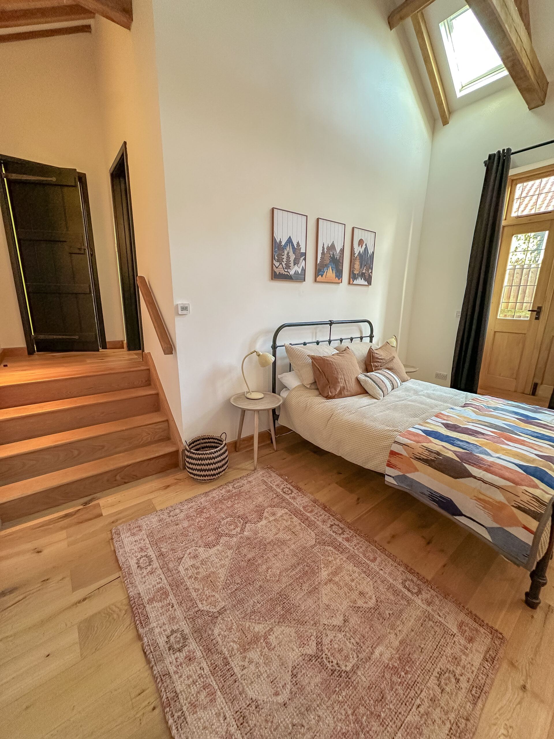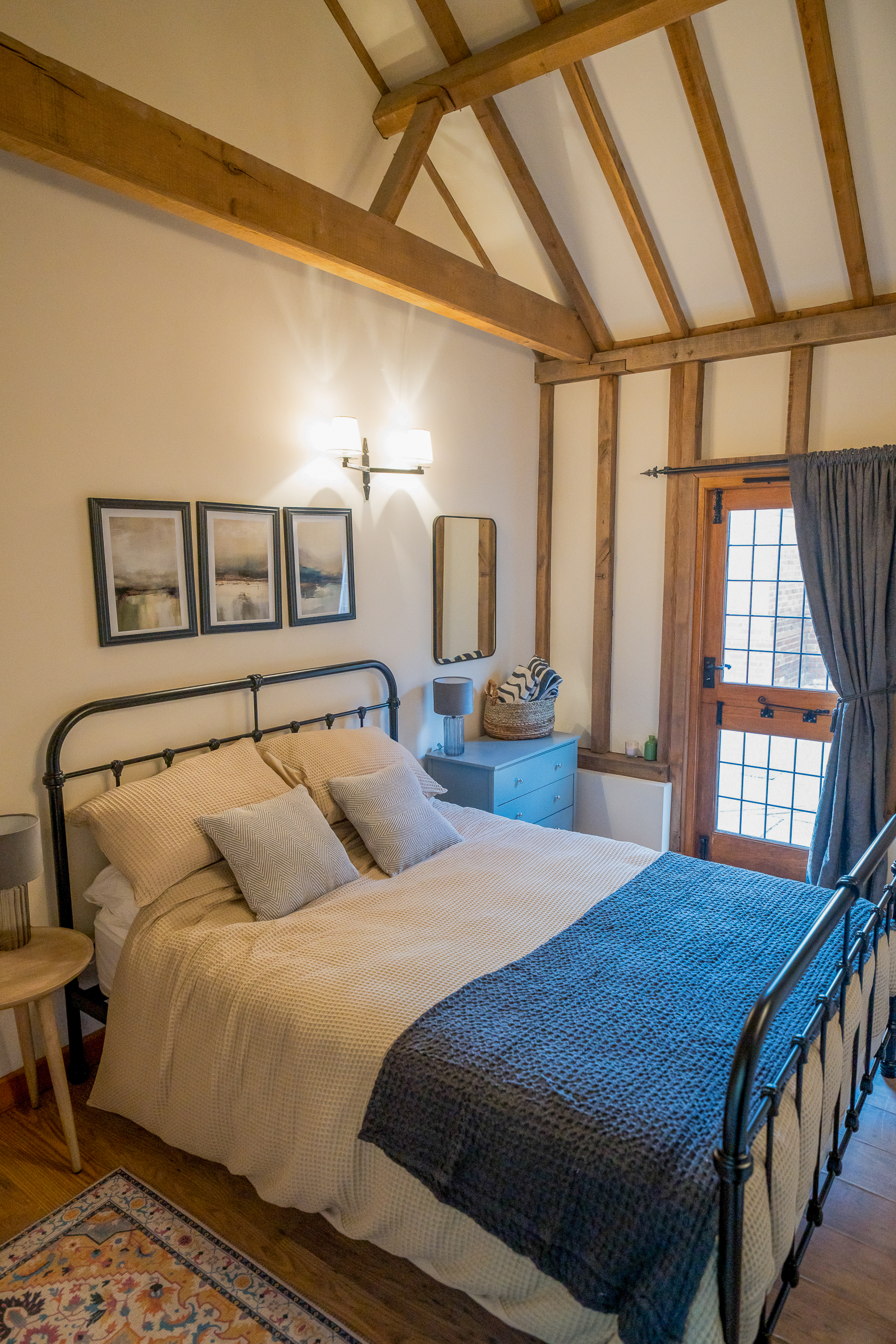 Master Bedroom (Ensuite): A beautiful retreat with exposed beams, high vaulted ceilings and French doors opening out onto the garden. The décor is soft, comforting and boutique-hotel chic. The ensuite features a modern shower, contemporary tiling and a bright, fresh finish.