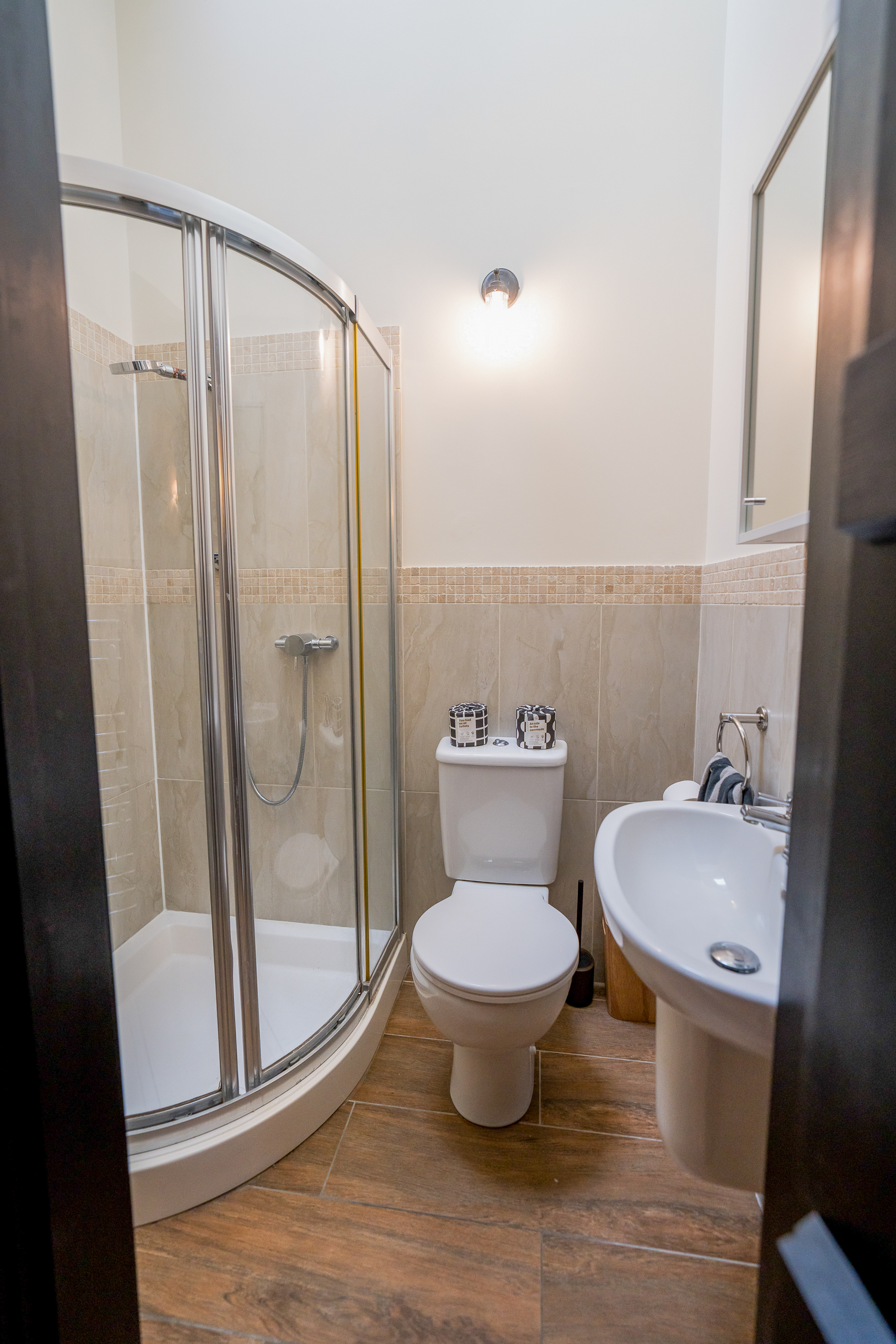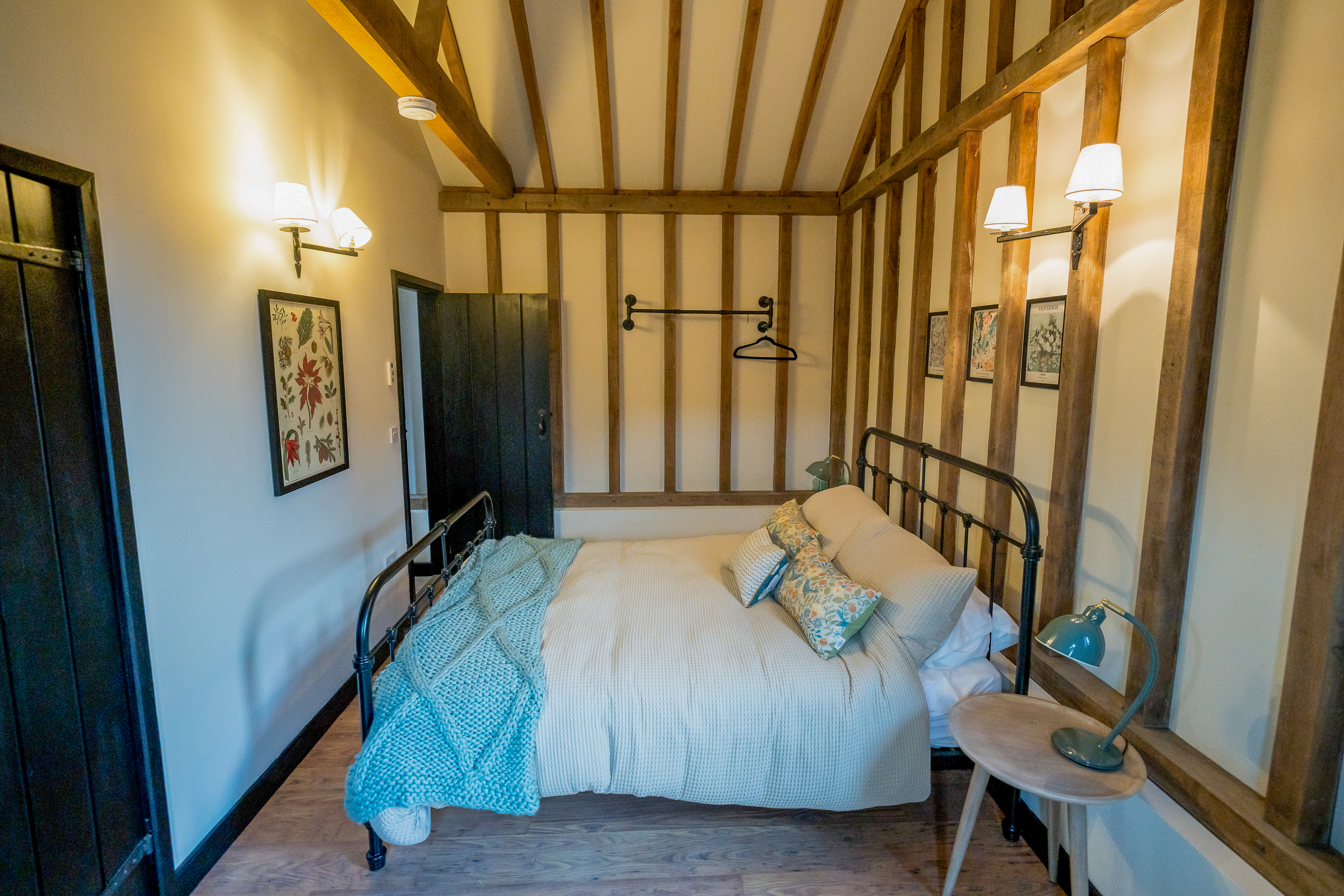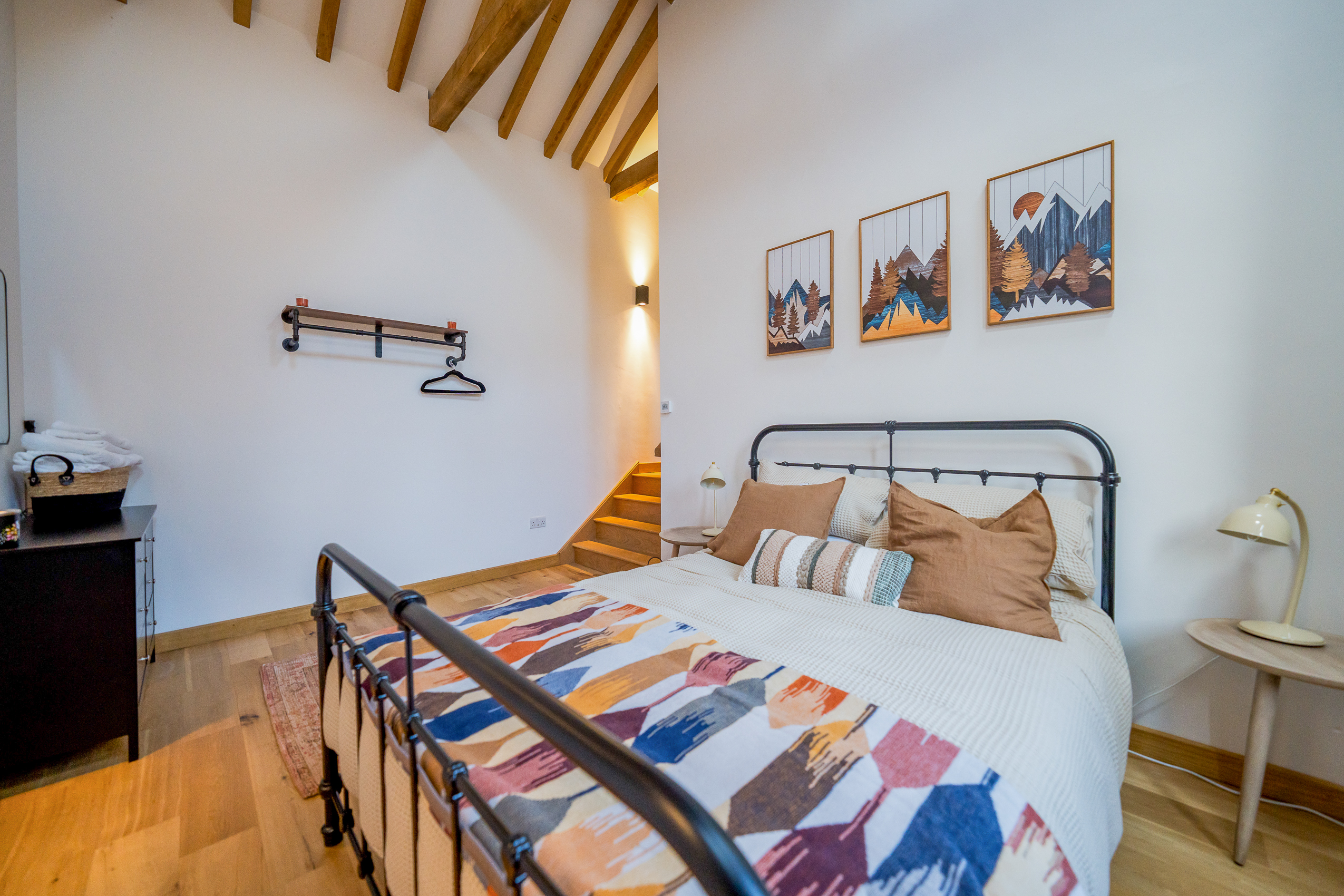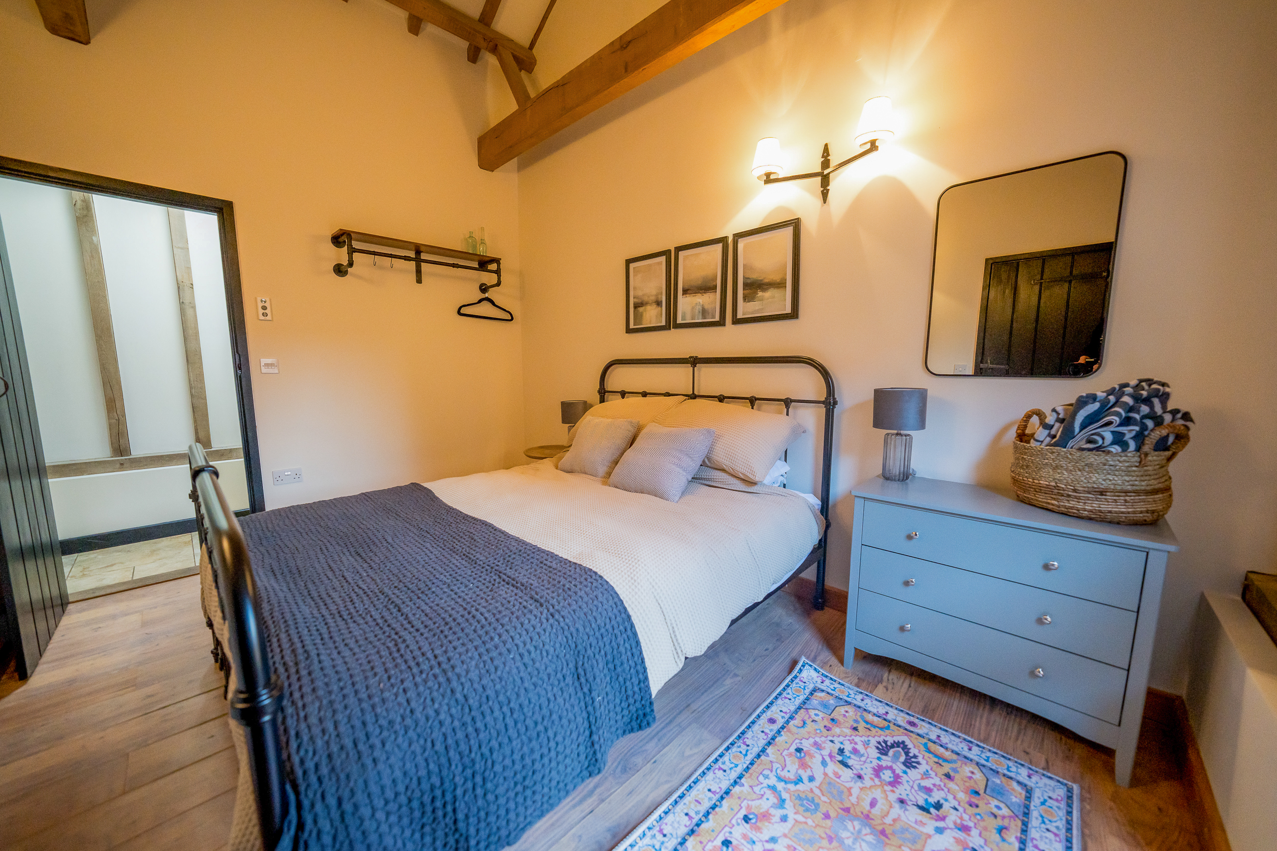 Bedroom Three – The Grey Room (Ensuite): Serene and stylish in soft muted tones. Vaulted ceilings, hanging space, timber framing and warm lighting create a peaceful retreat. The ensuite shower room comes with shower enclosure, wc, sink, and storage.