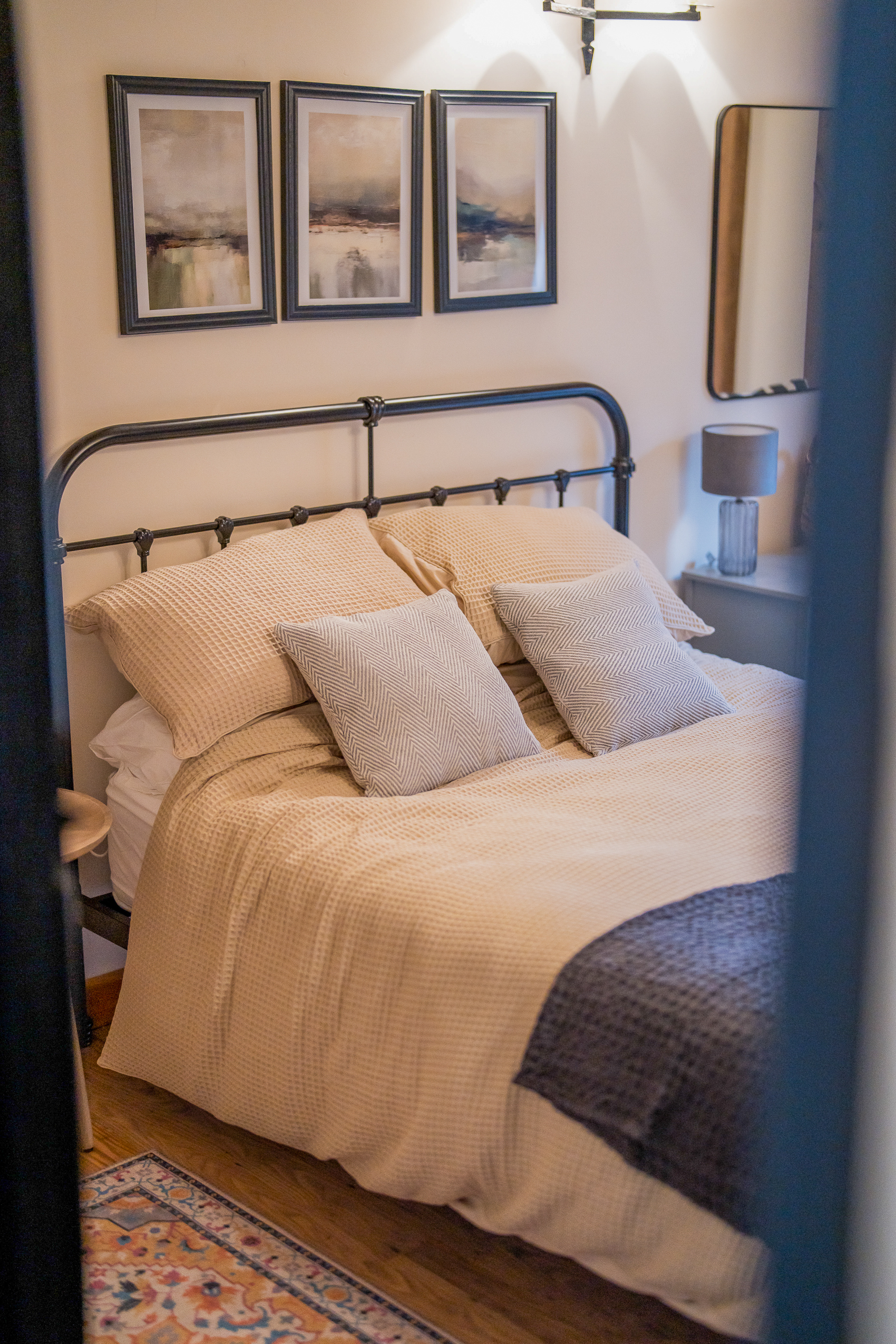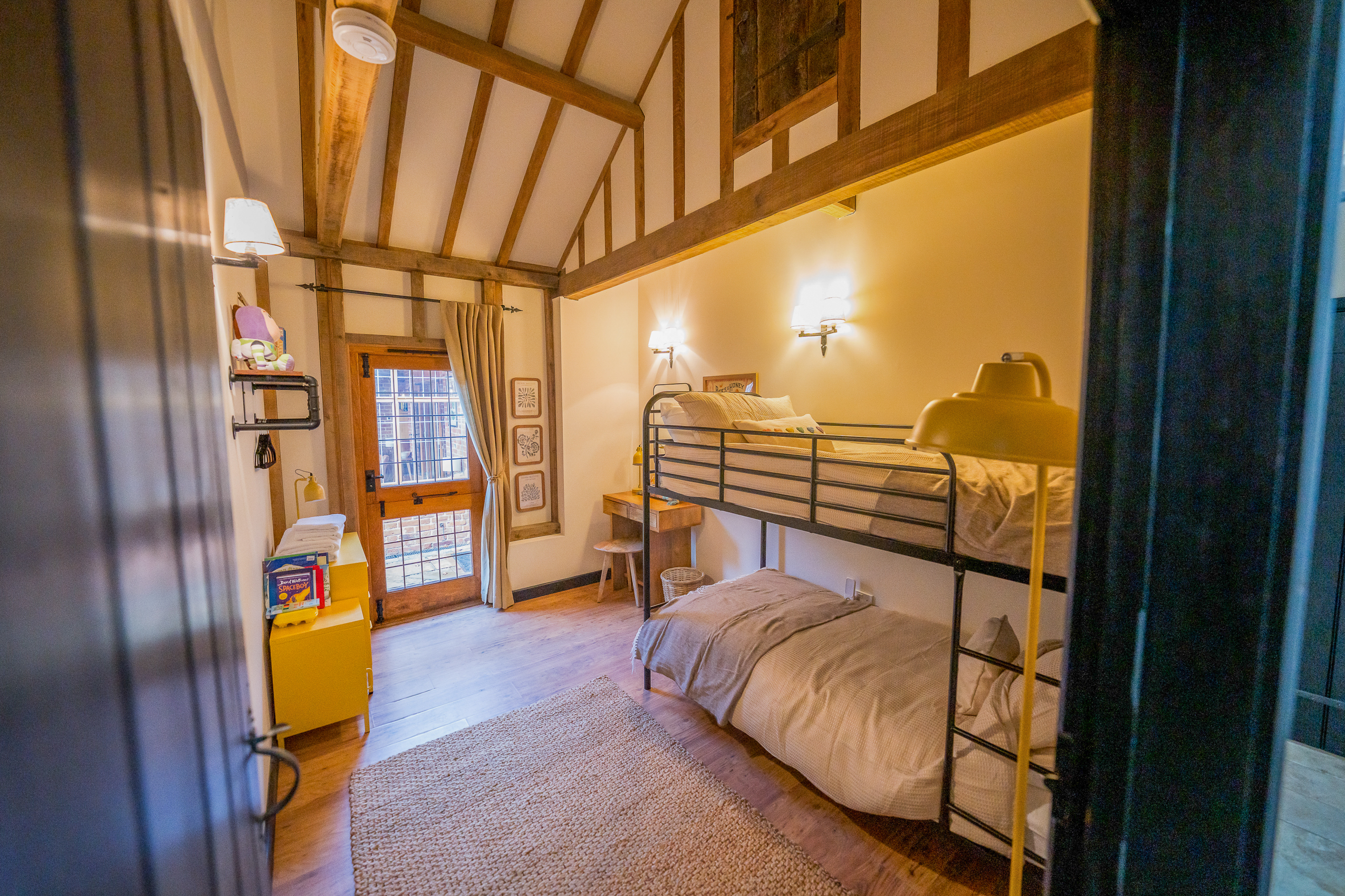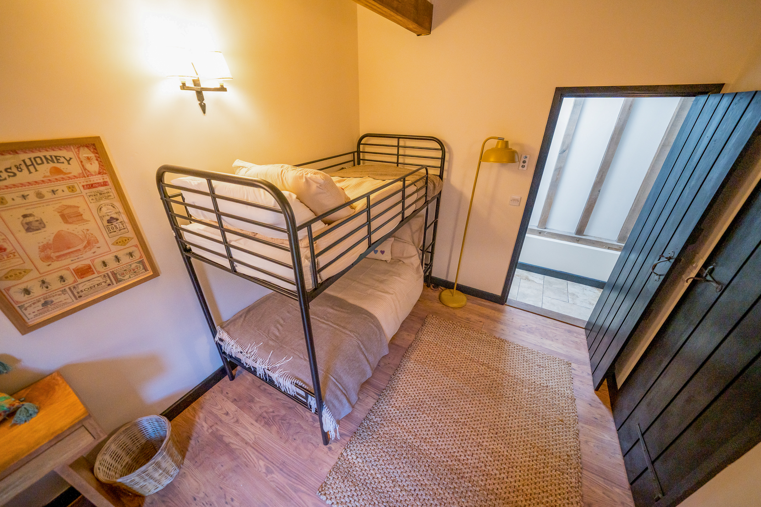 Bedroom Four – Kids Room (Ensuite): Cosy, cheerful and designed with families in mind. Includes a metal bunk bed, natural flooring, jute rug, writing desk, games shelf and stable doors opening onto the private courtyard. Perfect for children or teens. The ensuite shower room comes with shower enclosure, wc, sink, and storage.
