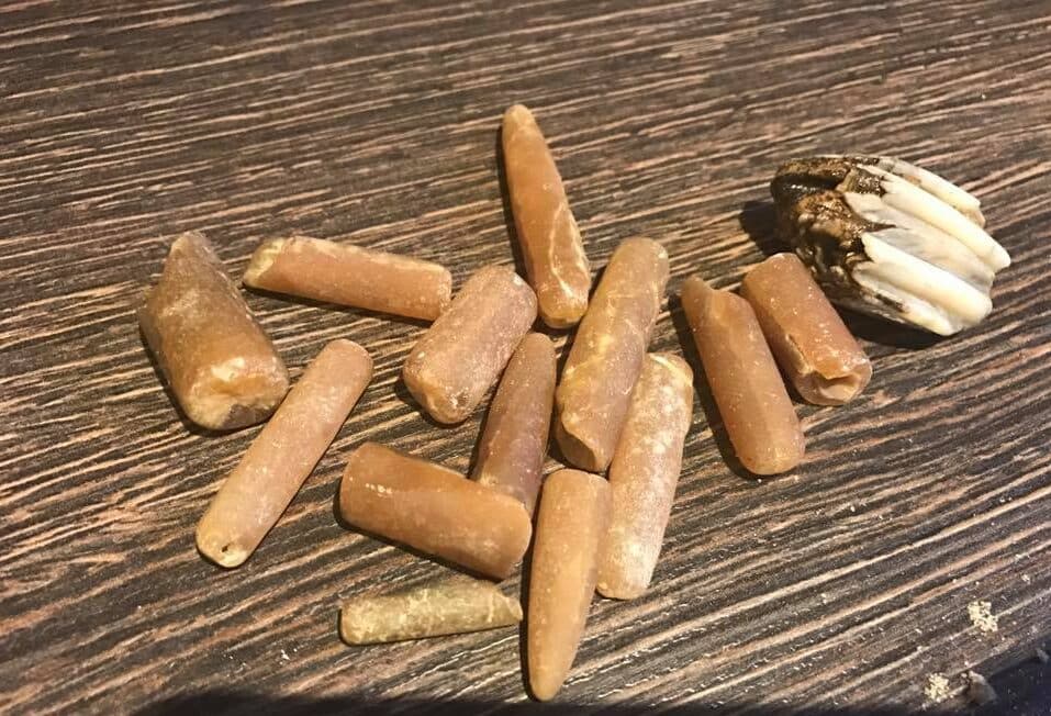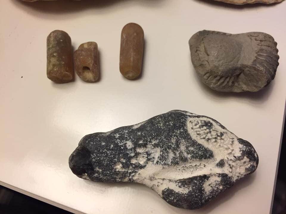 Above are some examples of rare finds from our coast, belonging to Karen and her Daughter. The first picture is an ammonite fossil, the middle is an ammonite fossil from Happisburgh, that isn’t preserved in the local stone which means it’s probably a glacial erratic (brought south by glaciers) most likely from Jurassic Yorkshire. The dark flint in the middle picture has some sea sponge impressions on it and the long thin ones are belemnites. The last picture is of yet more Belemnites – about 101 million years old , and a Bison priscus tooth around 700,000 years old!