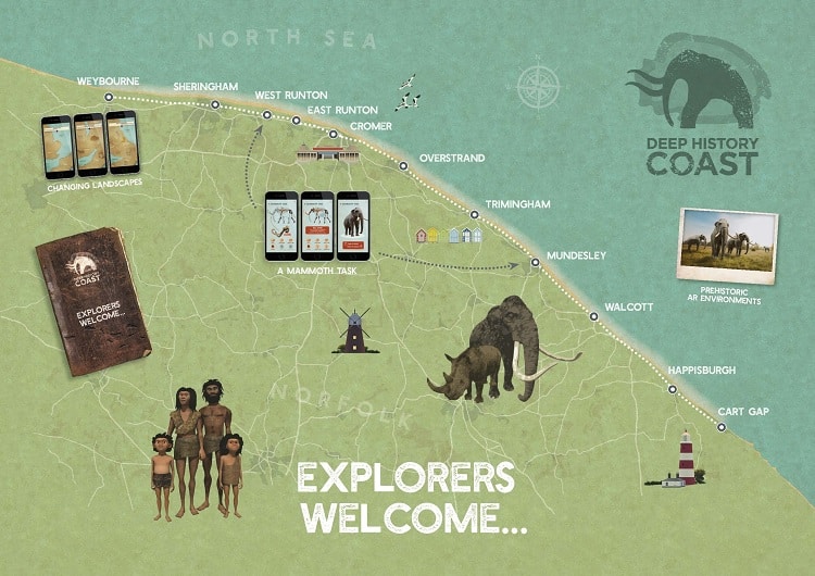 There are ten App-led walks along the 36km of coastline from Weybourne to Cart Gap where you will find eleven Discovery Points. At each of the Discovery Points you can trigger the app via the Hominin icon and see early man and his family in their natural environment as they interact with you and become your very own tour guide. At key viewing points, the App will transform the current landscape into 360 degree views of Doggerland and each walk will give visitors the chance to ‘collect’ virtual treasurers along the route which are stamped into their own collectors’ journal. Don’t forget to take a selfie with our augmented reality animals and share it on social media via the app or directly to #DeepHistoryCoast.
