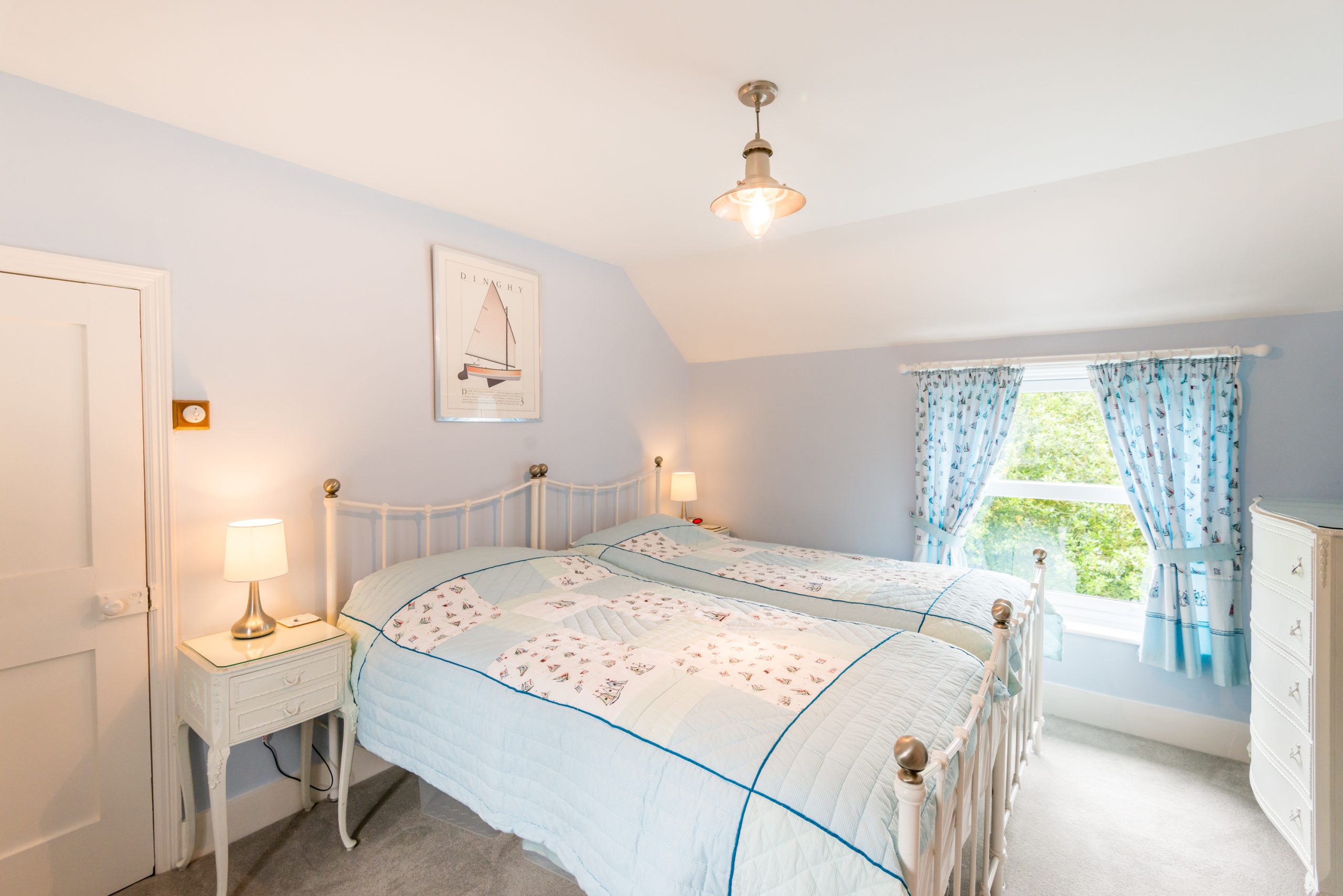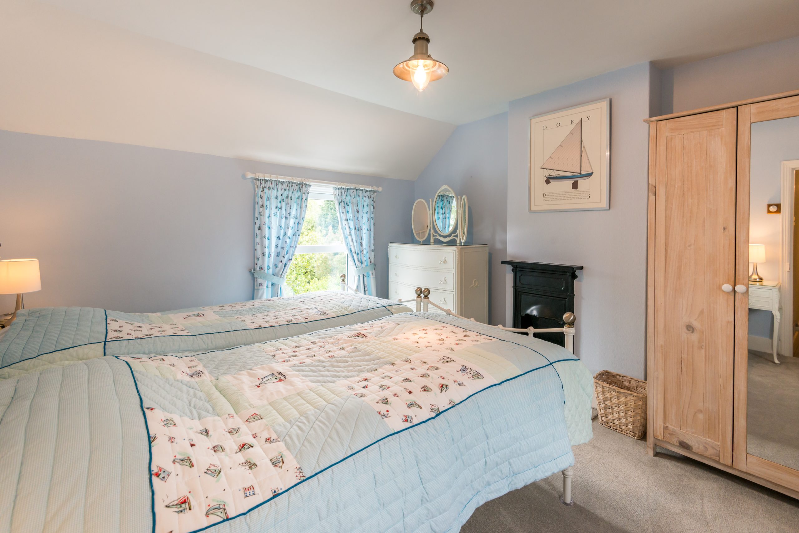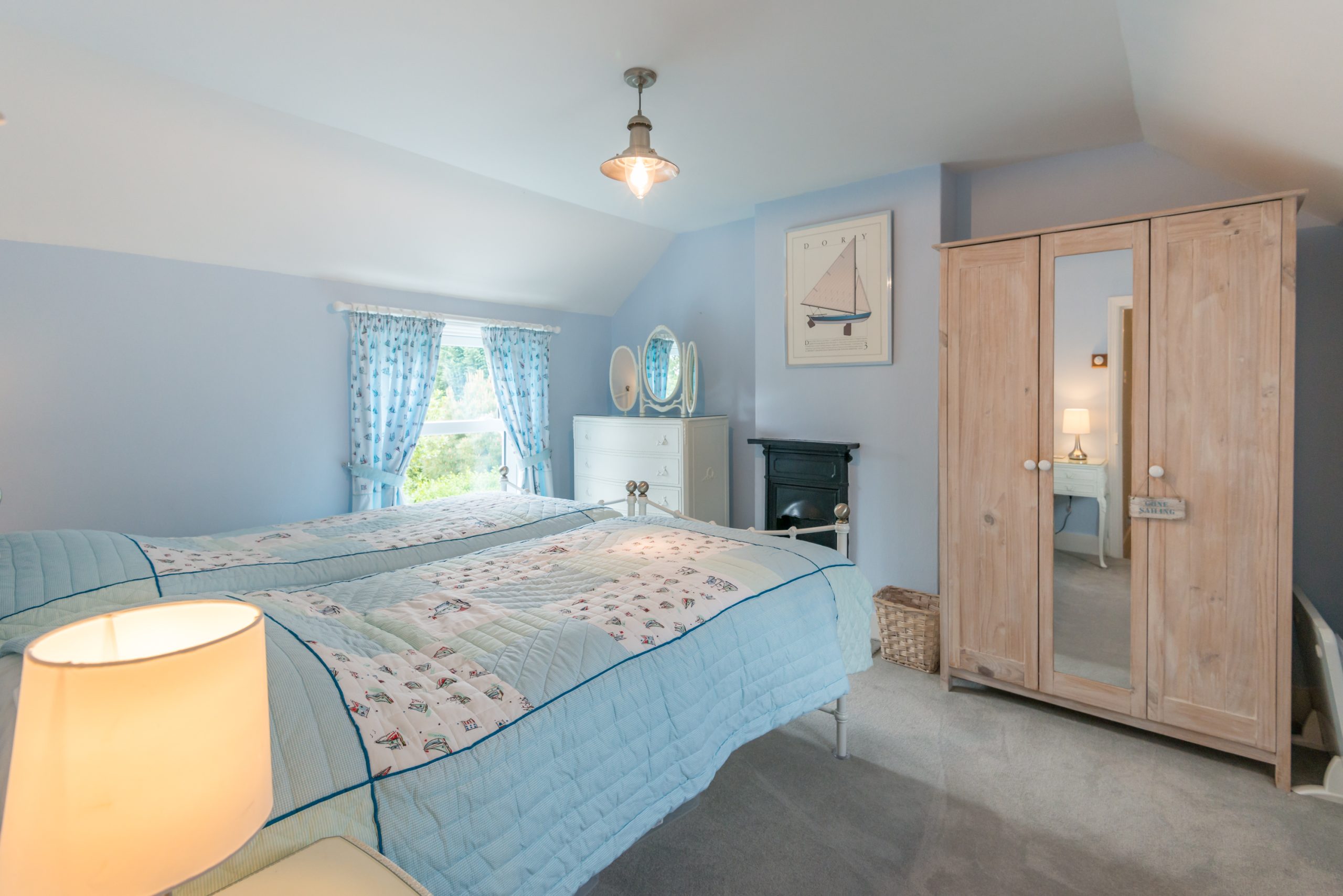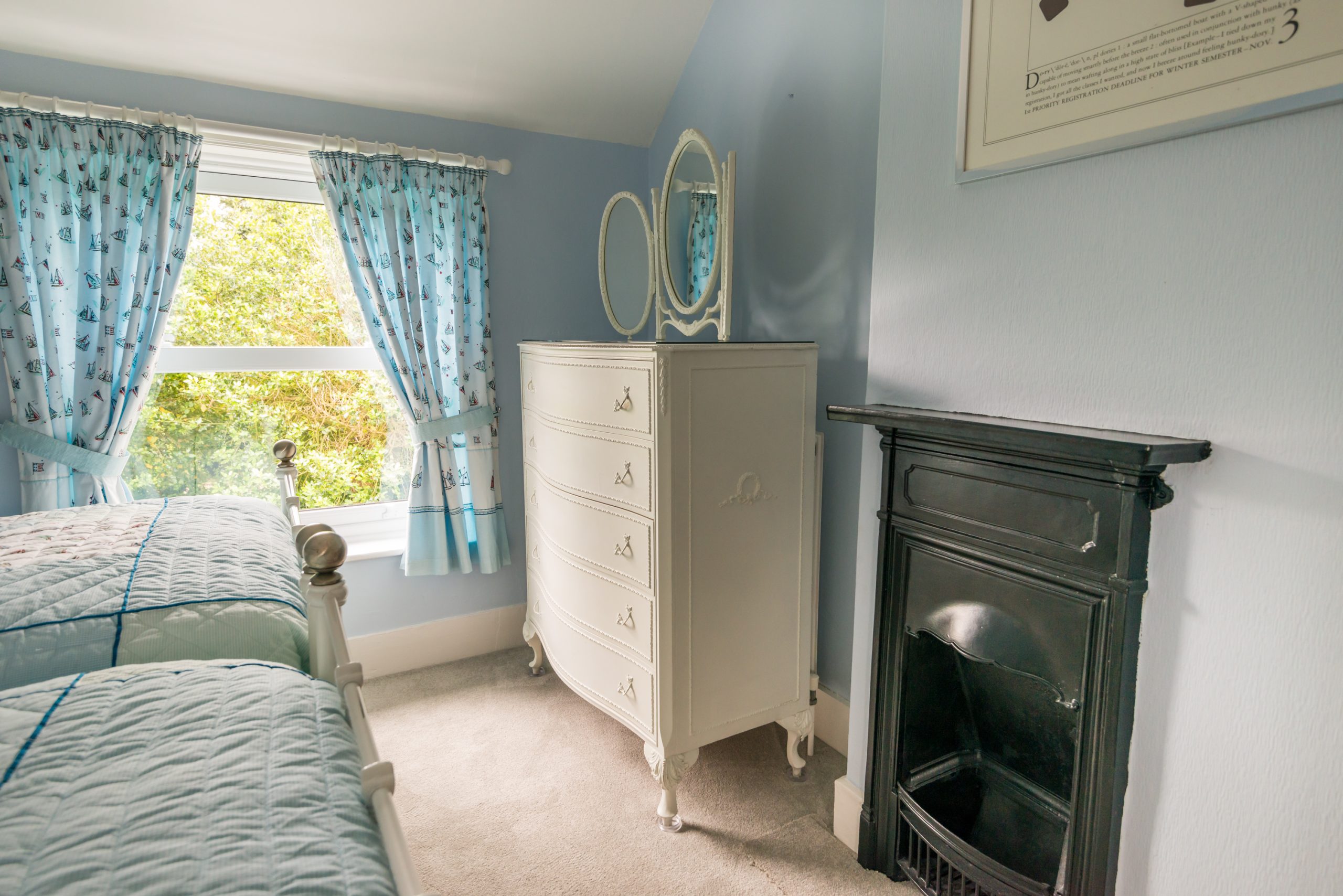 Bedroom 2 – Another light and airy room (with double aspect) with twin beds, side units, lamps, wardrobe and dresser. It has a beautiful ornamental original feature fireplace. (Hairdryer also supplied.)