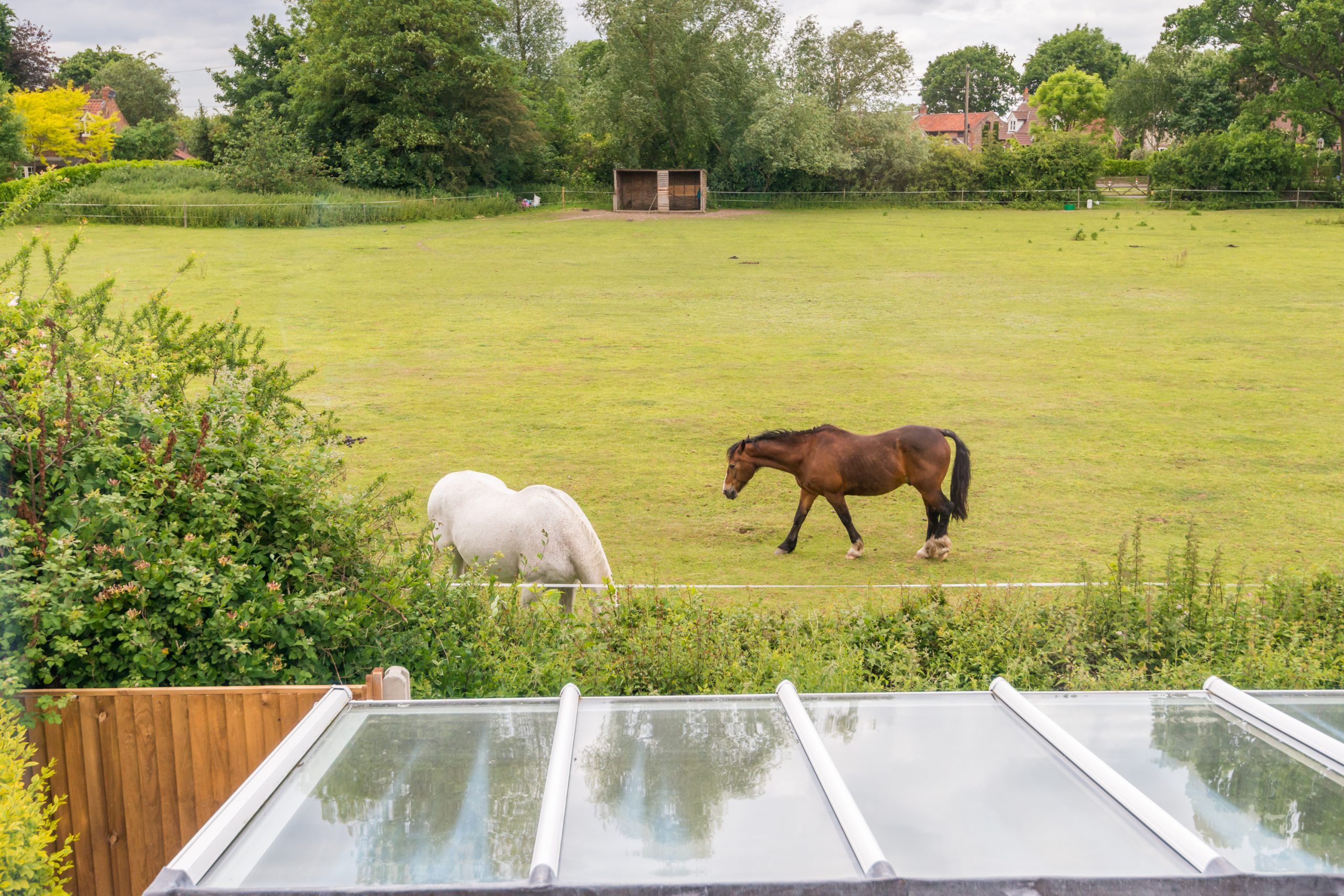 The field you can see from the vestibule is owned by Heath Cottage owners. Their field is used (free of charge) by the local Hickling animal charity FAITH and they have some very happy horses that make great use of the field.