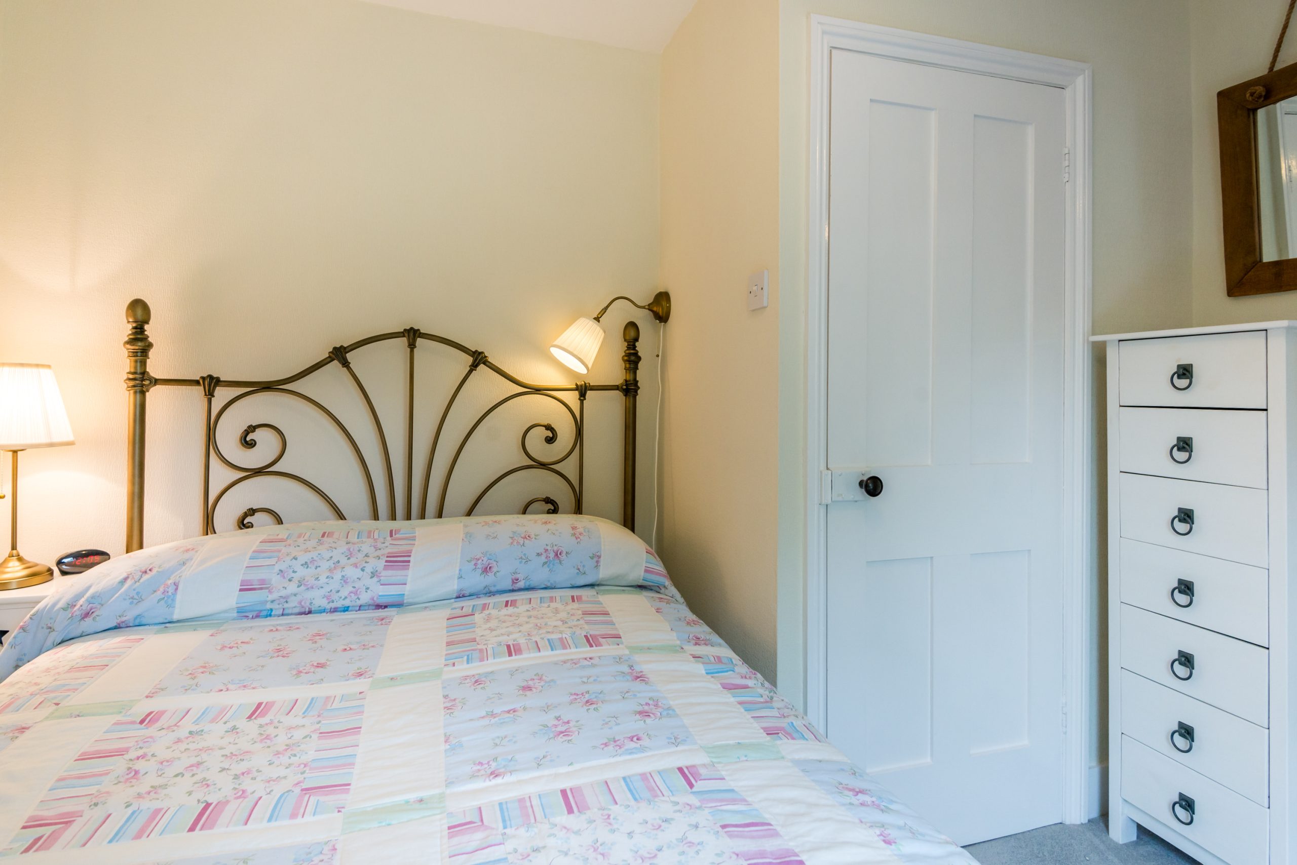 Bedroom 1 – Light and airy room with comfortable double bed, side table, lamp, drawers and wardrobe. (Hairdryer also supplied.)