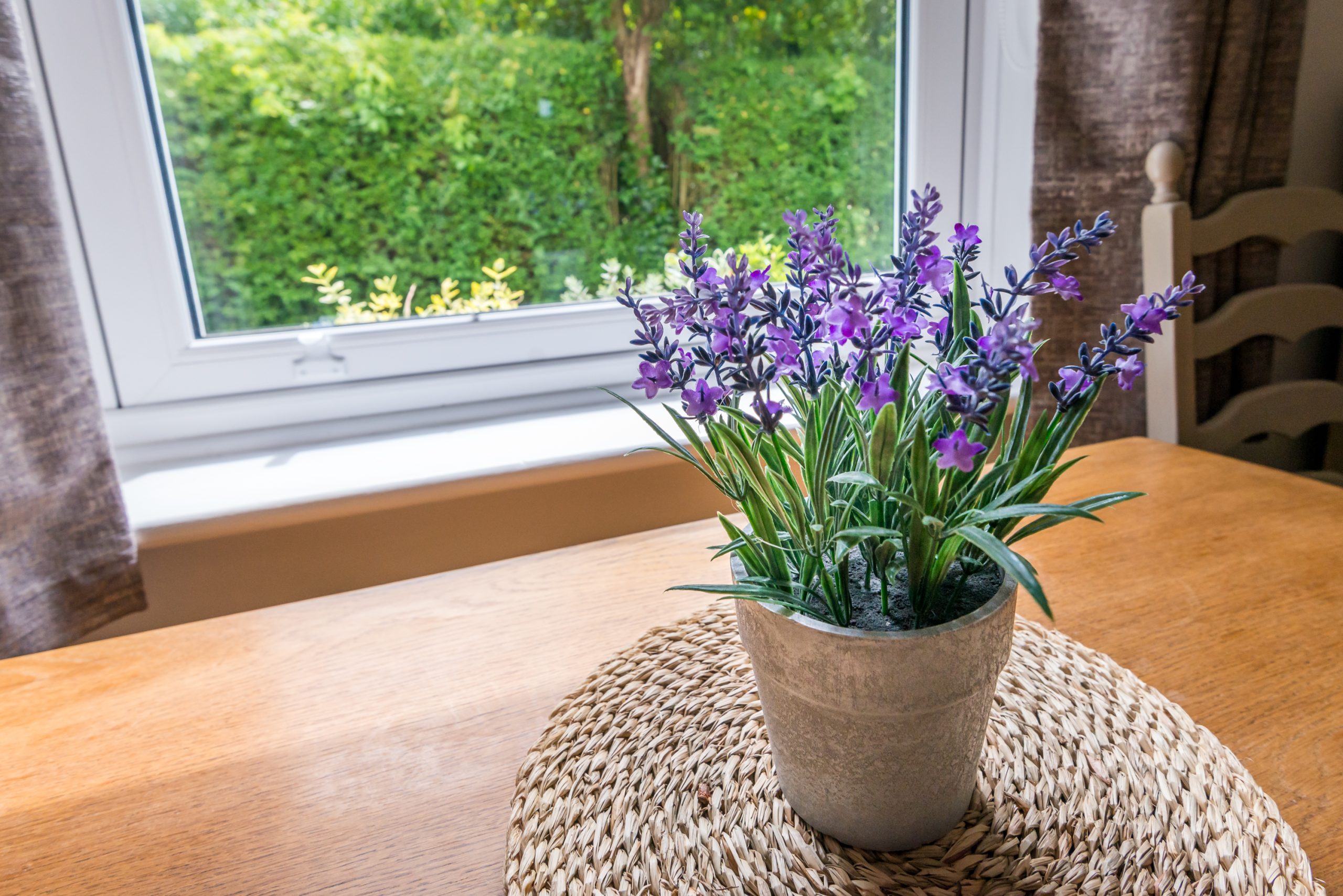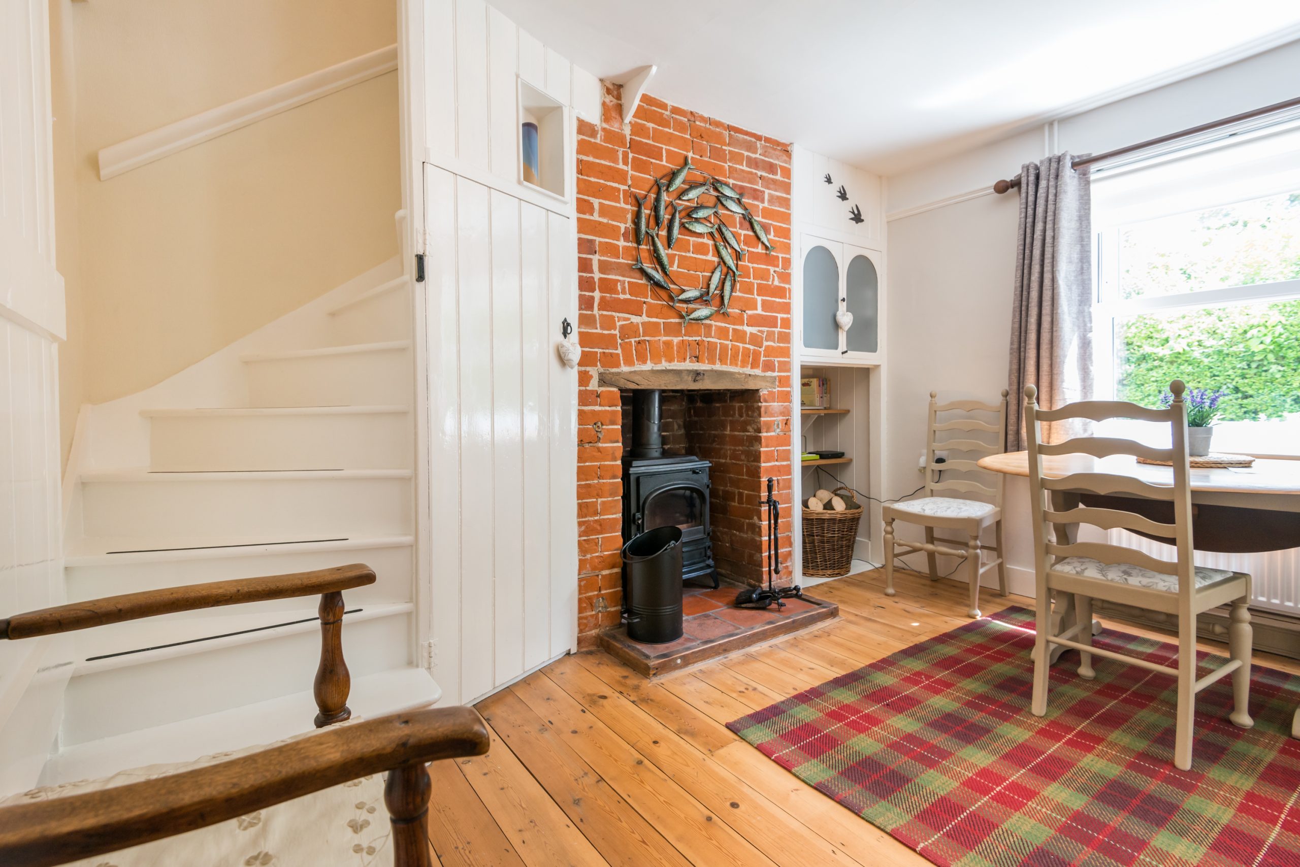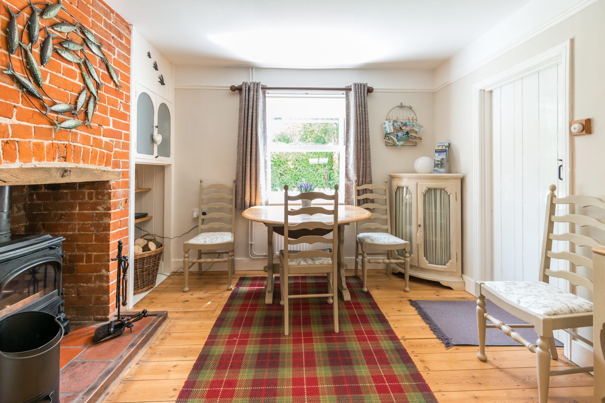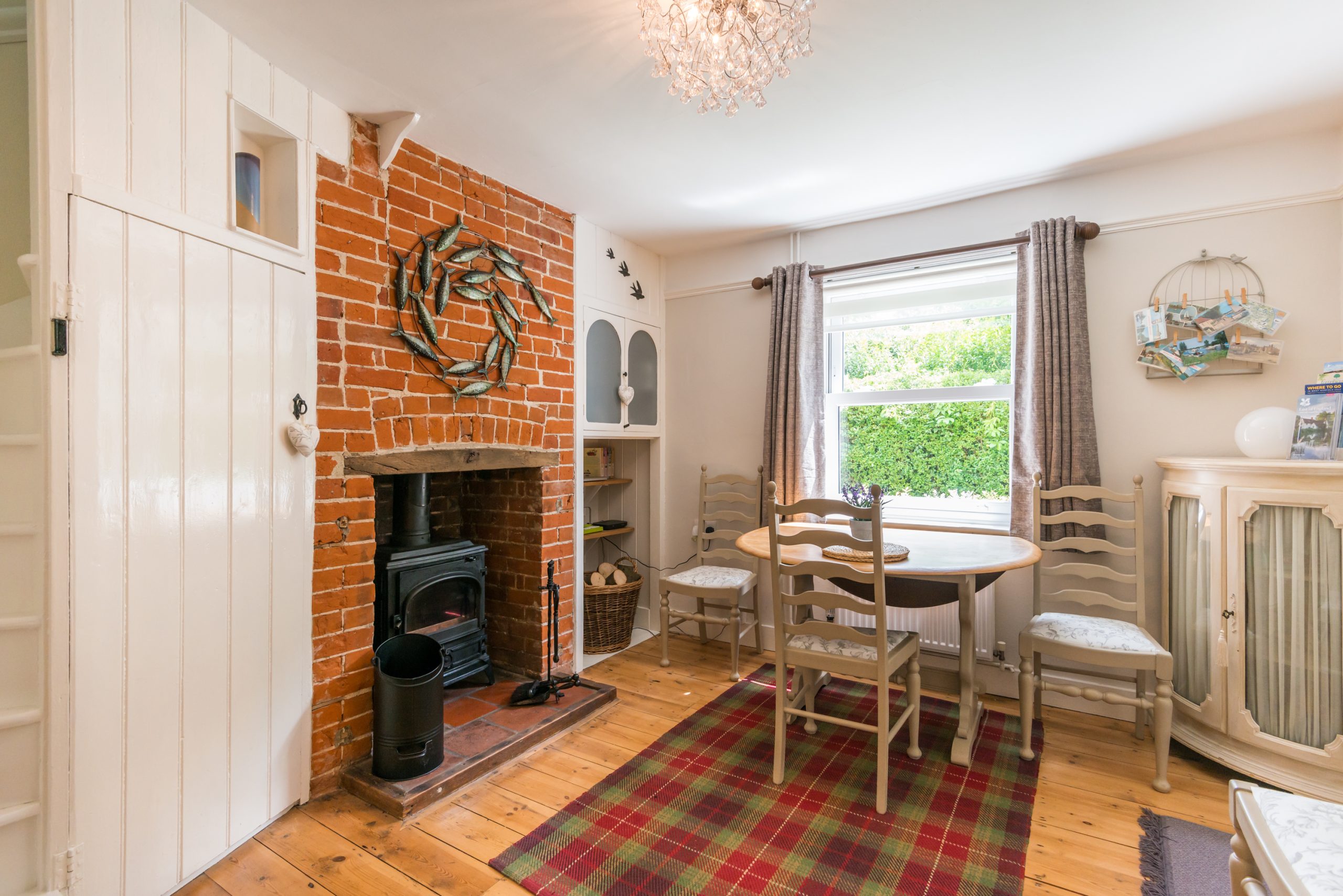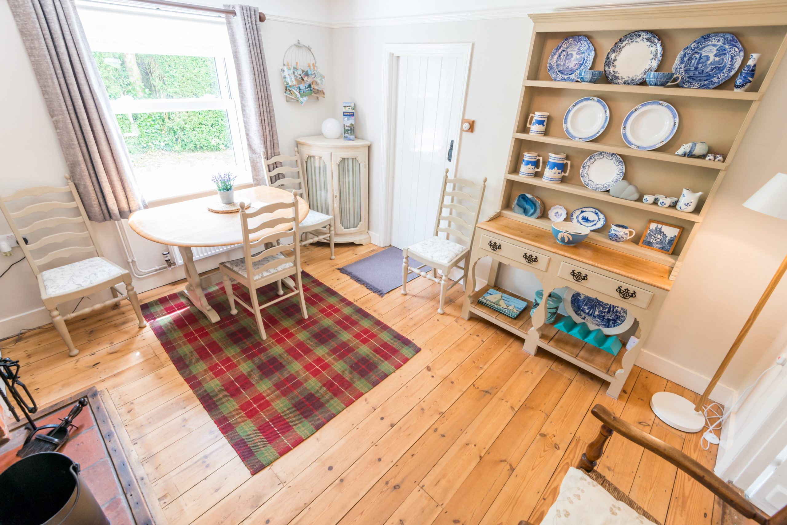 Dining Room – With lovely views to the side garden, a lovely dining table and chairs, cosy multi-fuel stove and beautiful dresser with ornamental plates and ornaments.