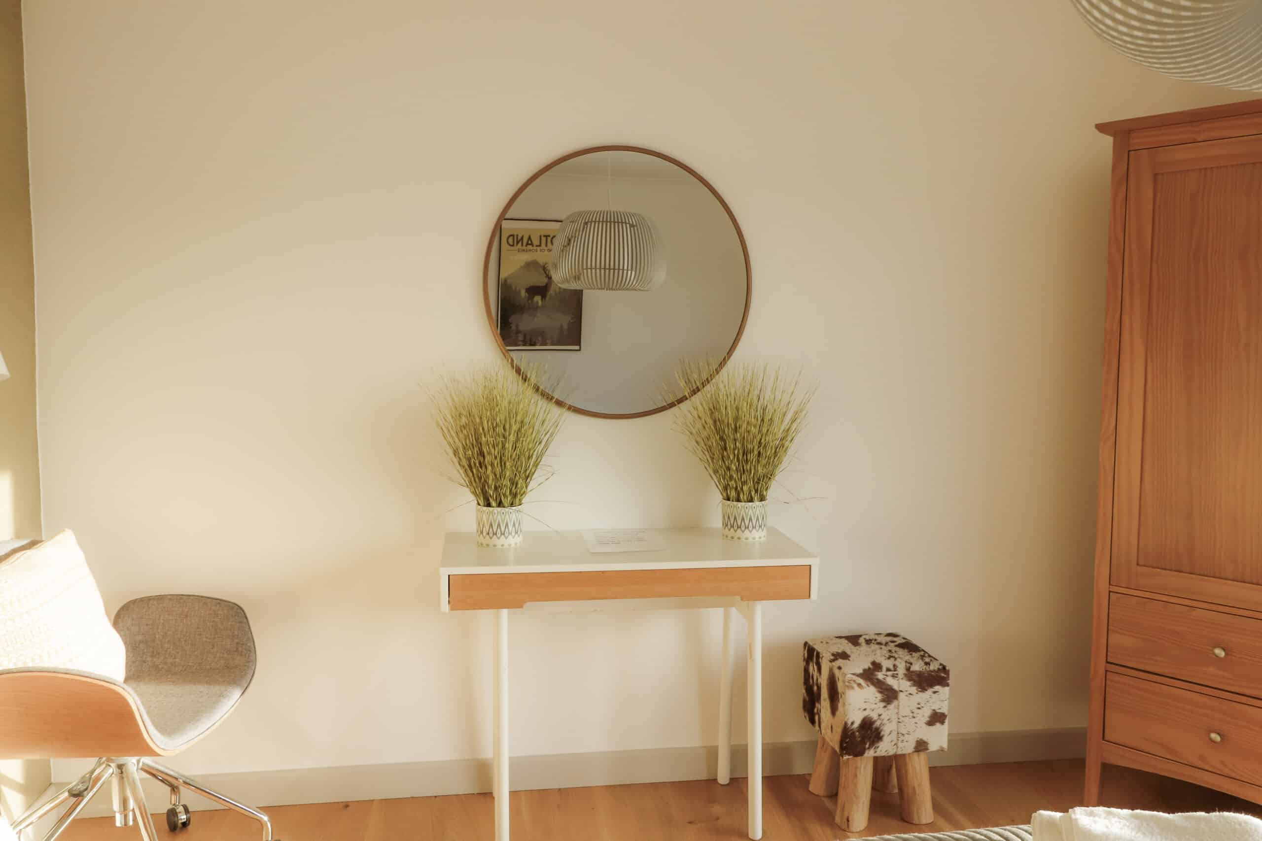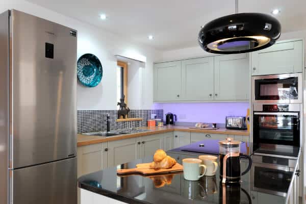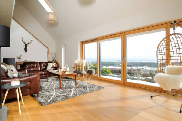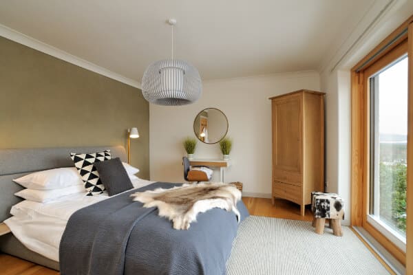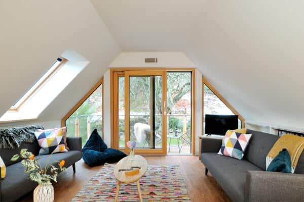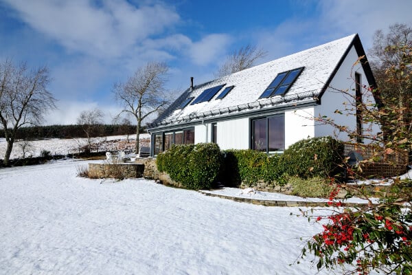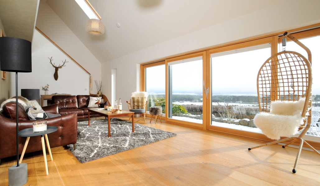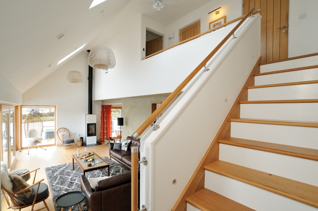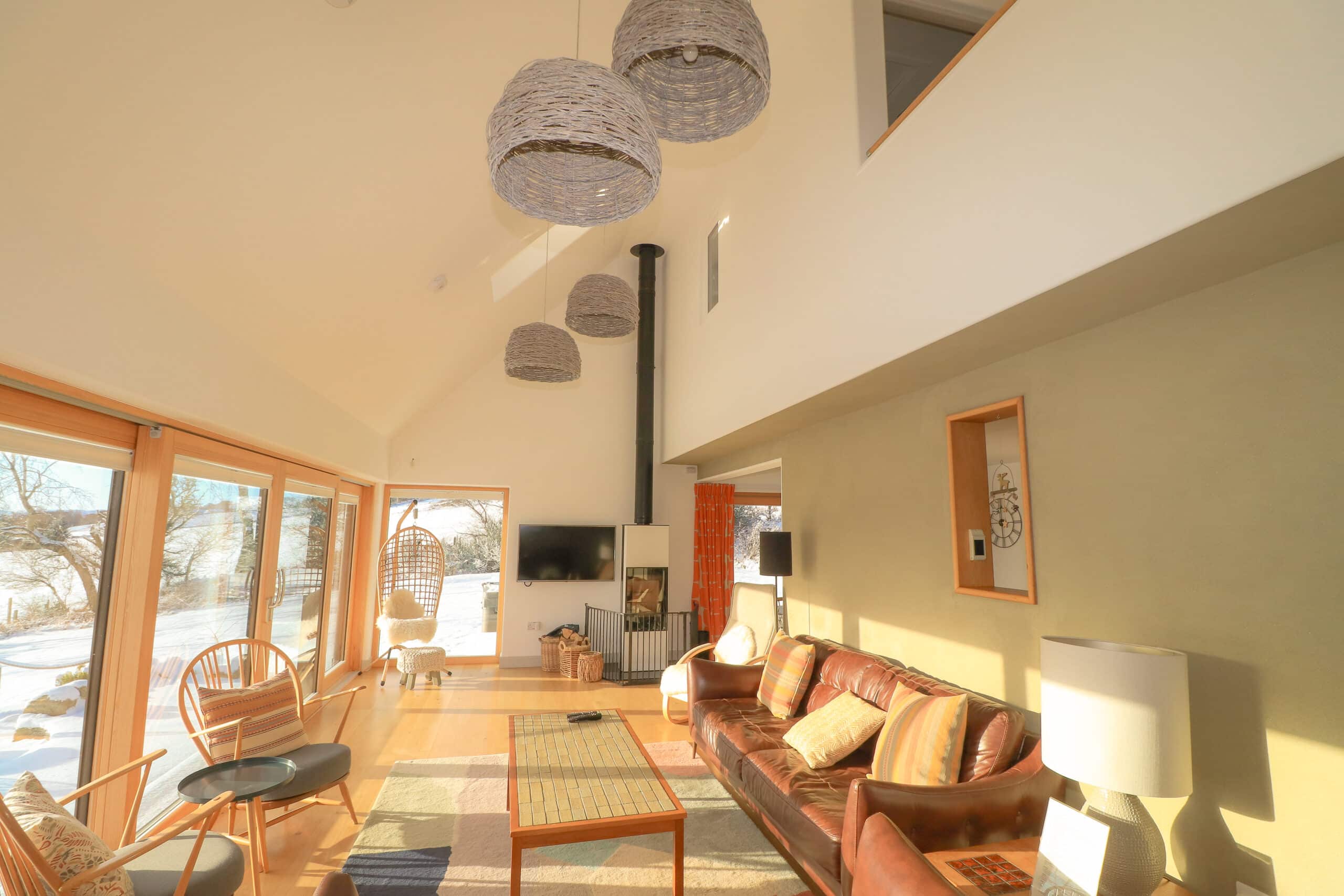 Tom’s Lodge is an eco build working towards a Green Tourism award. Being south-facing allows the sun’s warmth to be absorbed and retained by the main interior clay wall. The oversized triple-glazed frontage minimises heat loss, ensuring excellent energy efficiency and maximising the sun’s energy. A Contura log burner is the primary heat source throughout the open-plan designed house. The circulation of heat is aided by a ceiling fan directing rising heat downwards. Solar panels are used to heat the water, and adding 300mm of sheep’s wool within the exterior walls is an excellent, natural source of insulation.
