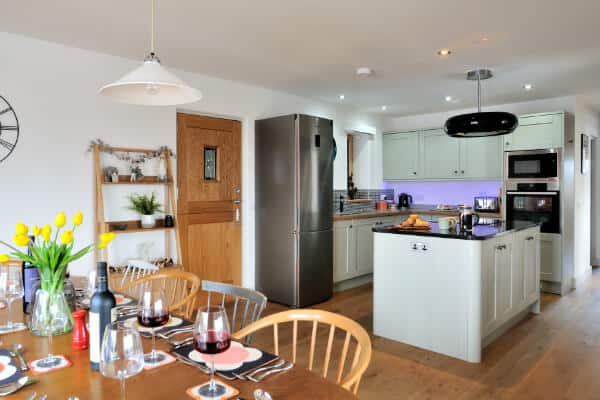 Kitchen area: With electric cooker, microwave and fridge/freezer, and utility room with dishwasher, washing machine and tumble dryer.