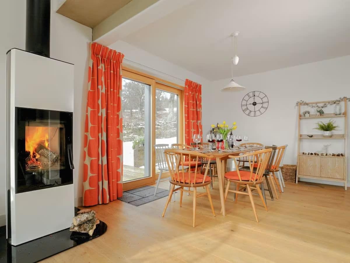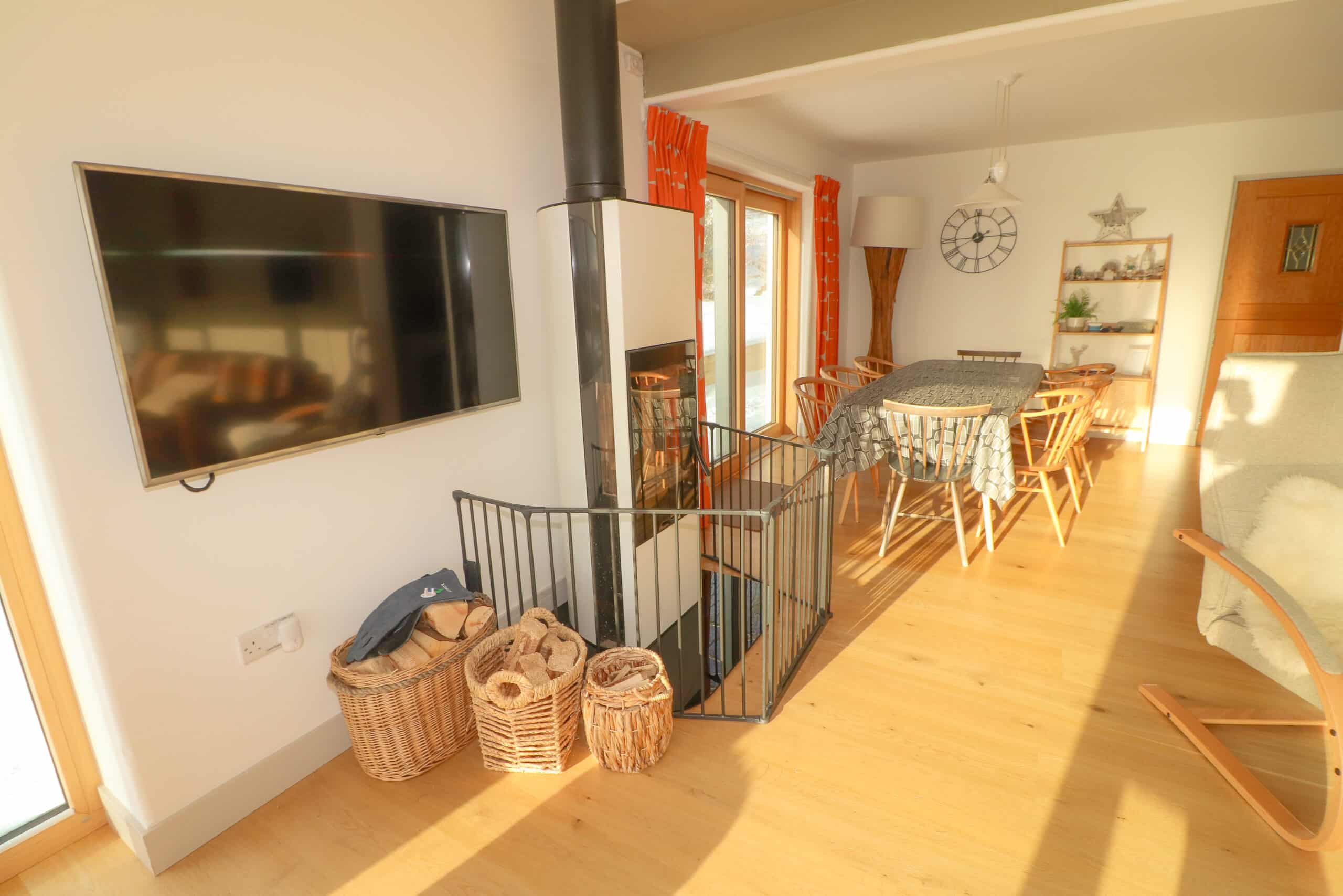 Open plan living space: With wooden floor, living area with wood burner and Smart TV, and dining area.