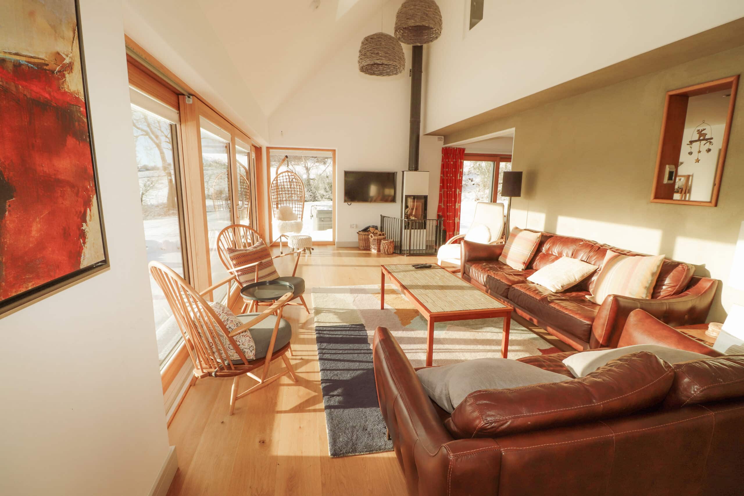 As you approach the Lodge, you cannot fail to be impressed by its setting, and stepping into it will immediately pull you to the outstanding view from the south-facing lounge glass wall. The spacious lounge is perfect for entertaining with gorgeous leather sofas, a dining table and a log burner. The log burner is the primary heating source in the Lodge, which has been cleverly built so that a heating system is not required. Fully insulated with sheep wool, the clay walls retain the heat from the log burner and natural sunlight from the south-facing glass lounge wall.