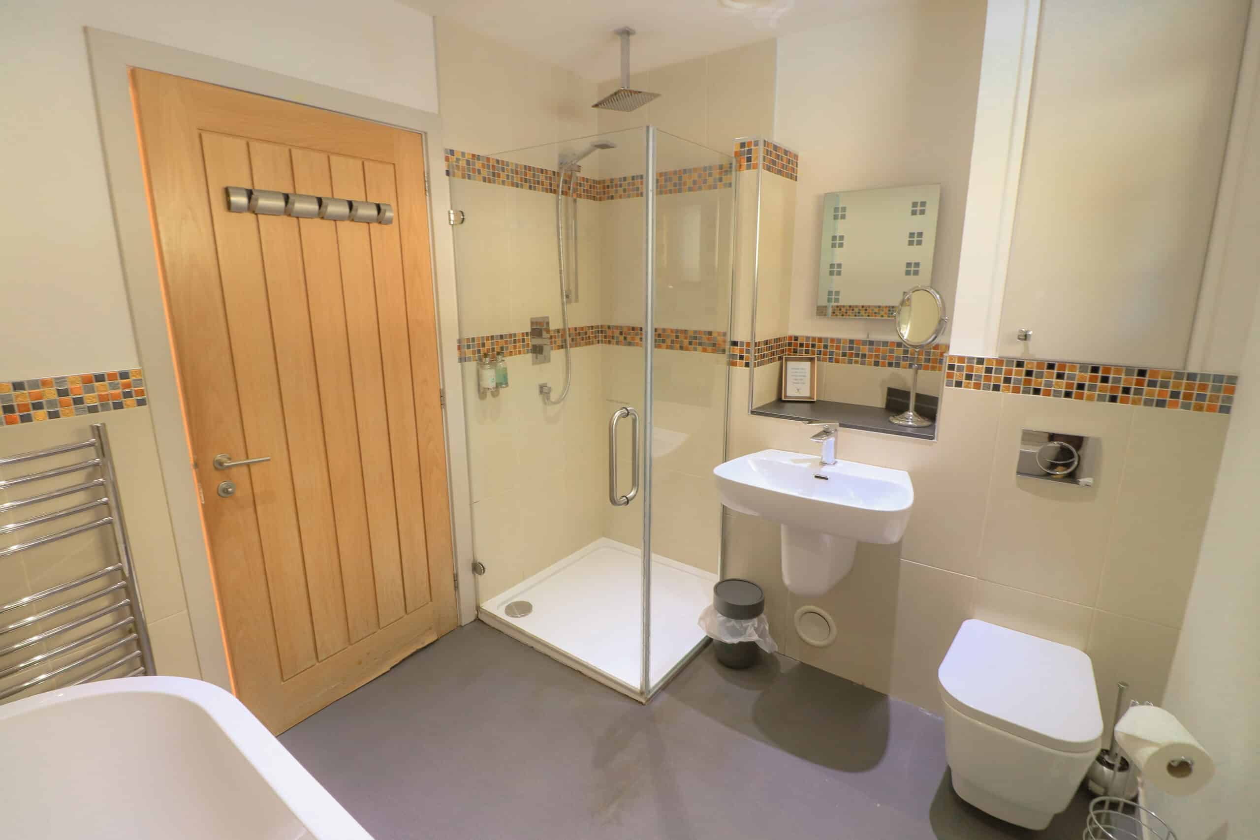 Wet room: With bath, shower cubicle, heated towel rail, toilet and tiled floor, and shower room with shower cubicle and toilet.