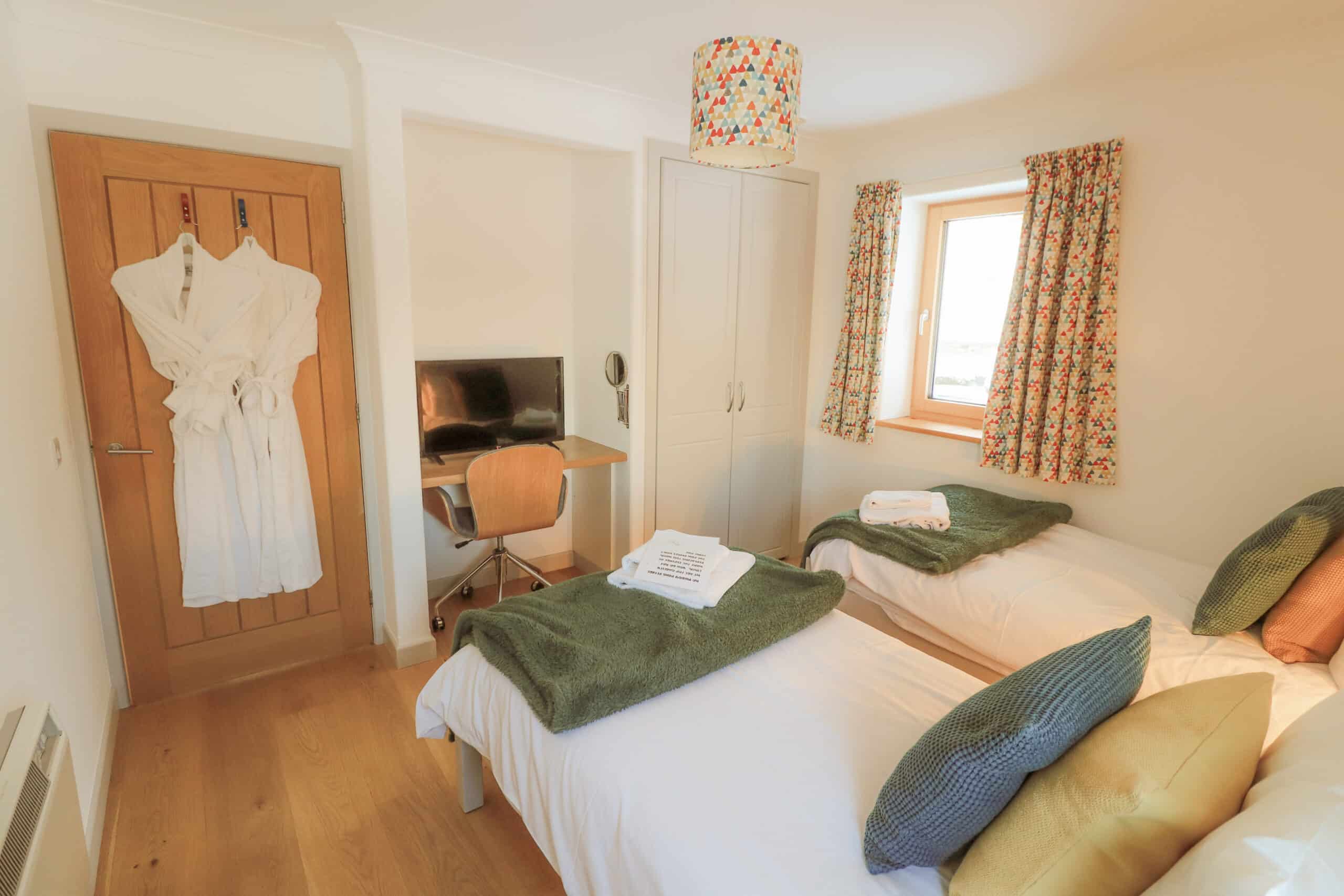 Bedroom 2: With twin beds, Smart TV and wooden floor.