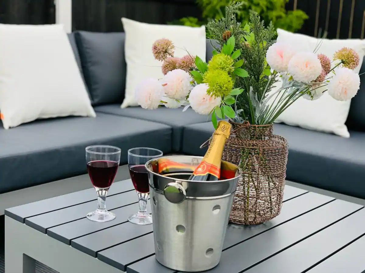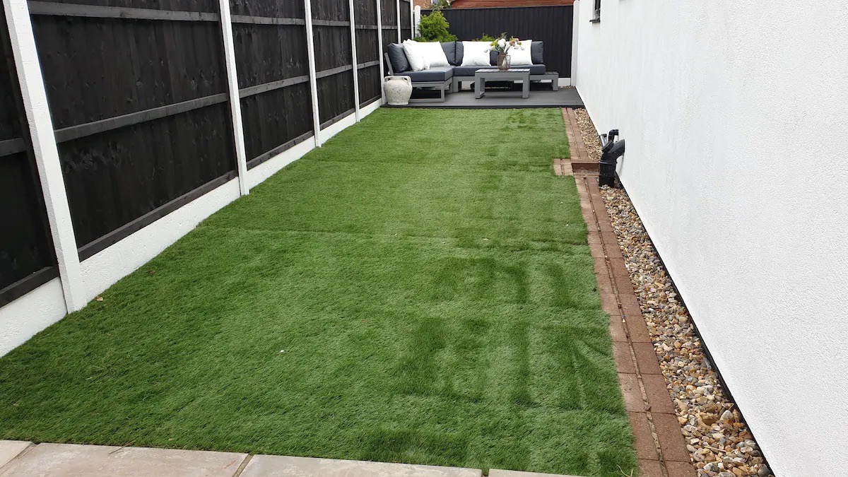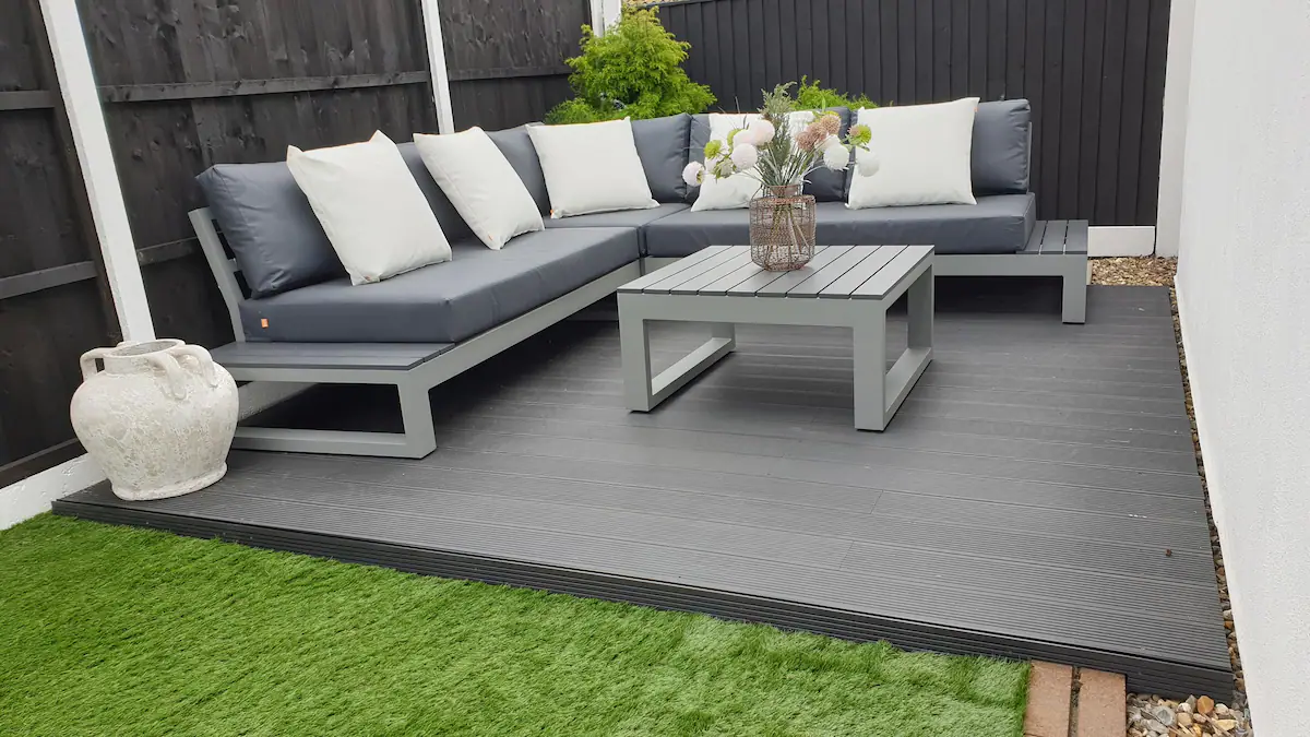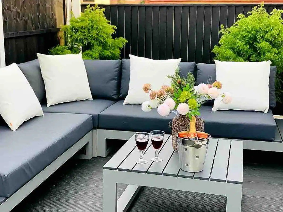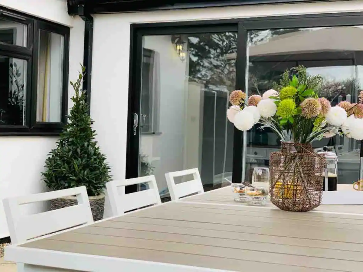 Villa Shona has two separate outdoor seating areas linked to the house by wide glass sliding doors to enhance the indoor-outdoor connection. The first space has a slabbed area, an outdoor lounge area with an L-shaped outdoor sofa to seat 8, and table on a decked surface, and the rest has artificial grass.