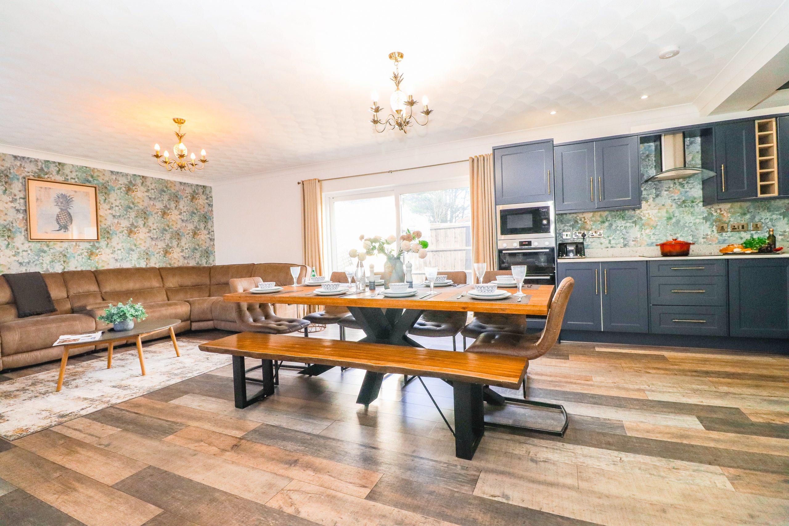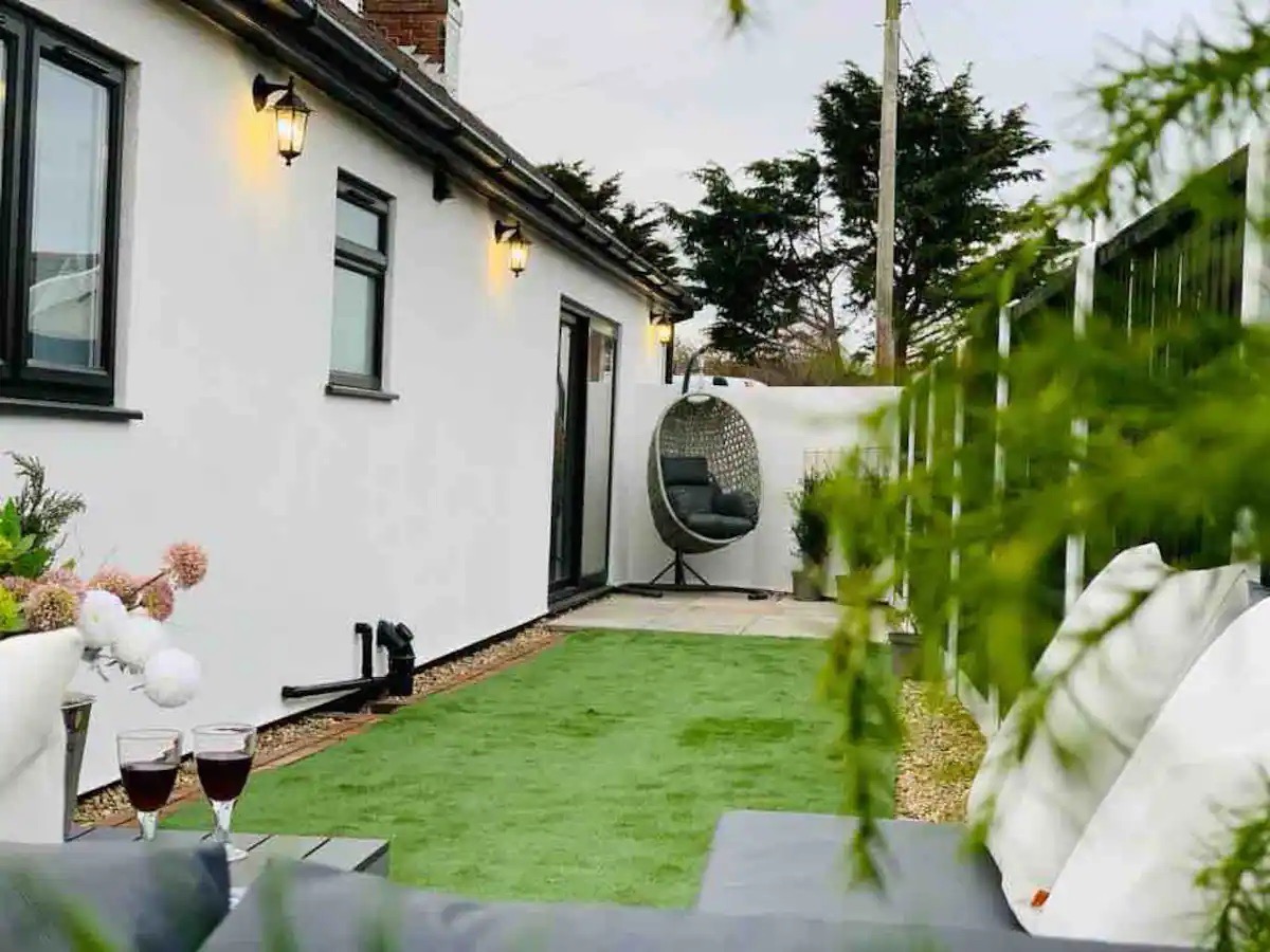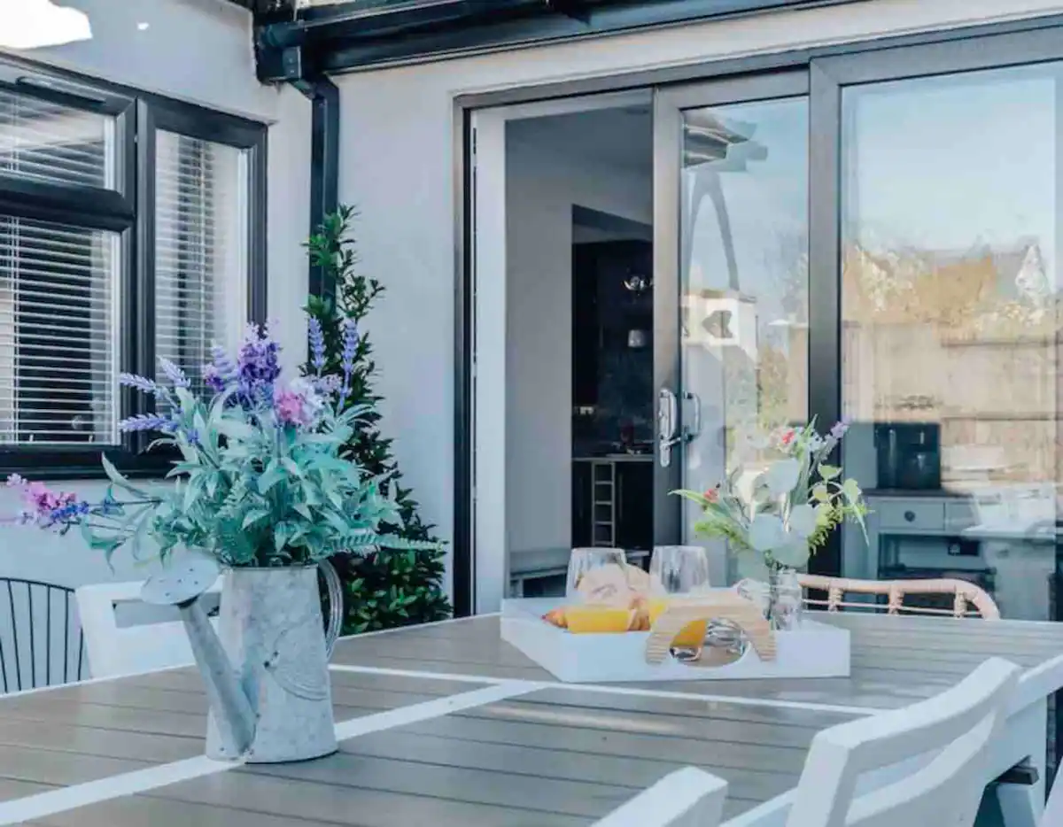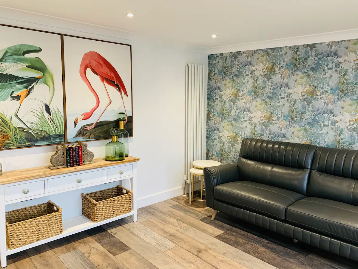 The lounge has a flat-screen smart TV and internet for guests to use, a large leather sofa, wooden floors, and patio doors to the garden.