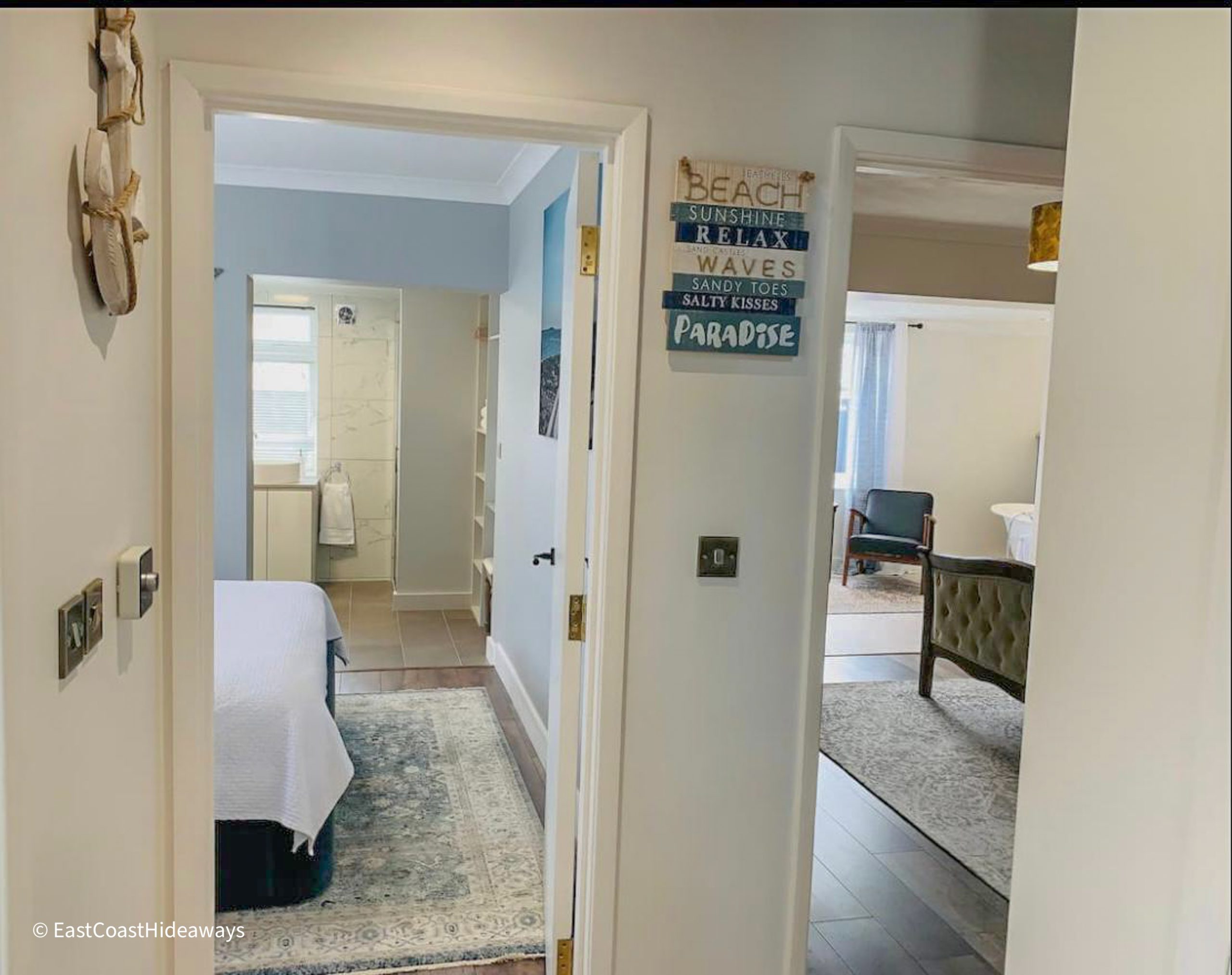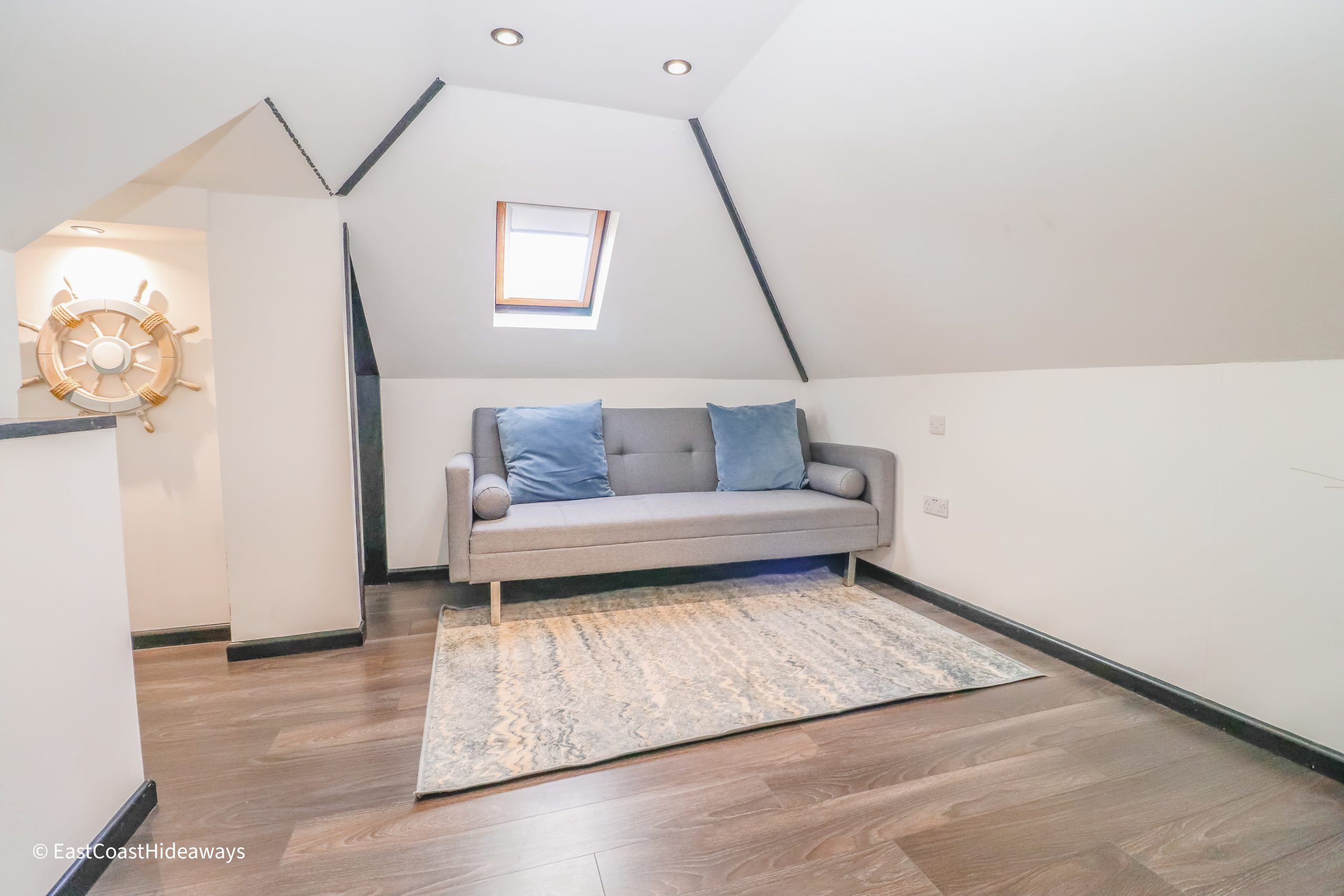 We do have a couple more separate seating areas internally in the master bedroom, in the third bedroom, in the kid’s loft space, and finally, in the front reception area. You can glimpse the sea from the loft window, and the beach is a mere three minutes stroll down a safe pedestrian walkway from the property.
