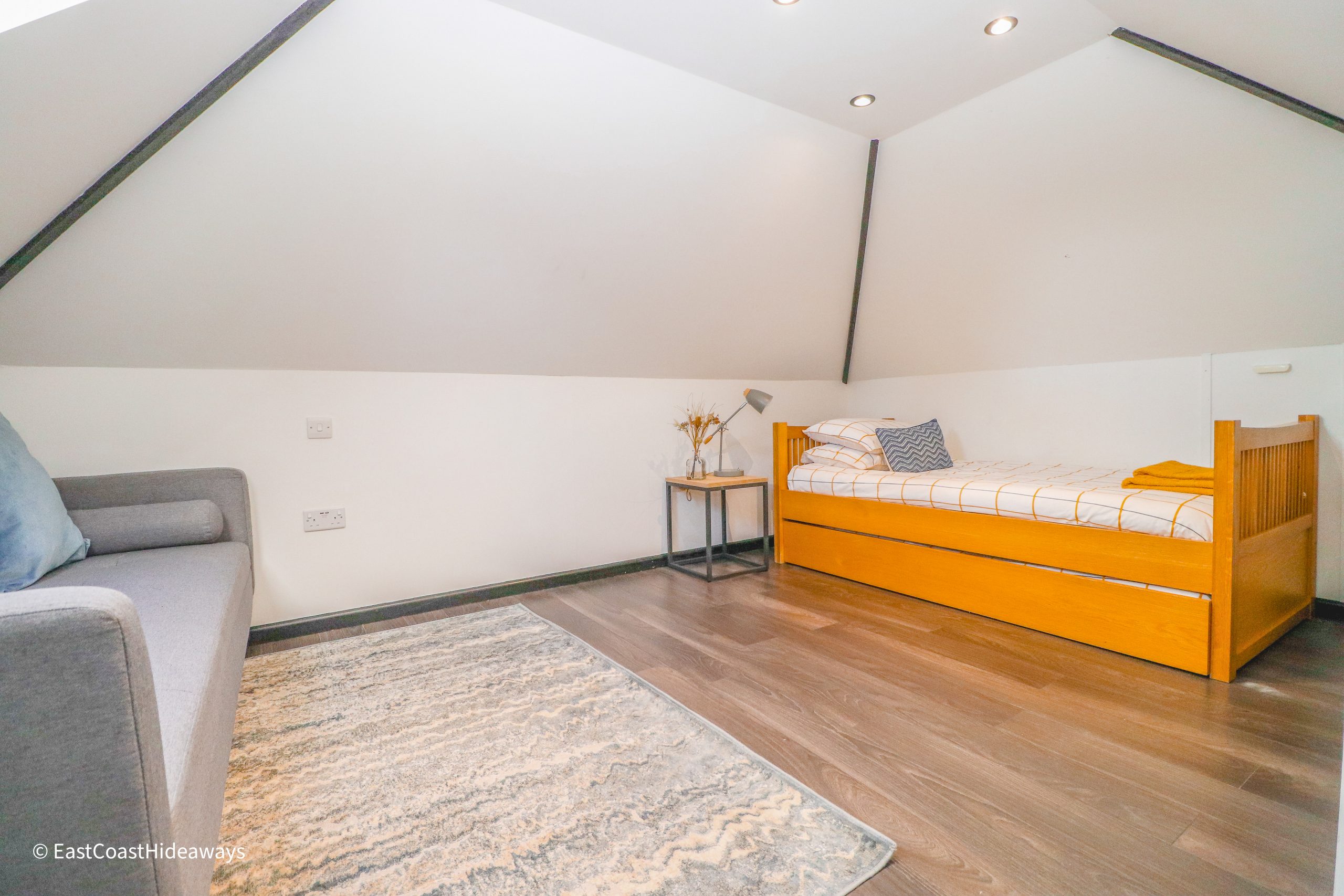 There are four bedrooms, including 2 ensuites, served by three bathrooms. Three bedrooms are on ground level, and there is a further single trundle room in the loft, up one flight of stairs.